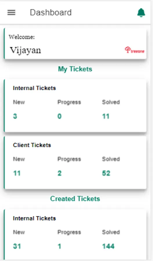 Treeone Team Mobile Application For Solving Customer Tickets. It has lot of options like Internal Ticketing, External Ticketing, Create Tickets, Client Tickets, Ticket Tracking. Internal Ticketing is used to create tickets by developers, External Ticketing and Client Ticketing are used to create tickets by Clients, Ticket Tracking will provide updates about tickets to customers as well as Developers.