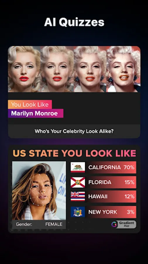 Unleash your creativity with our AI-driven quizzes & fun features. Find your Celebrity Look-Alike, turn yourself into a Cartoon Character, check out AI tests and more! The AI algorithms ensure realistic and breathtaking results that will leave you and your friends amazed.