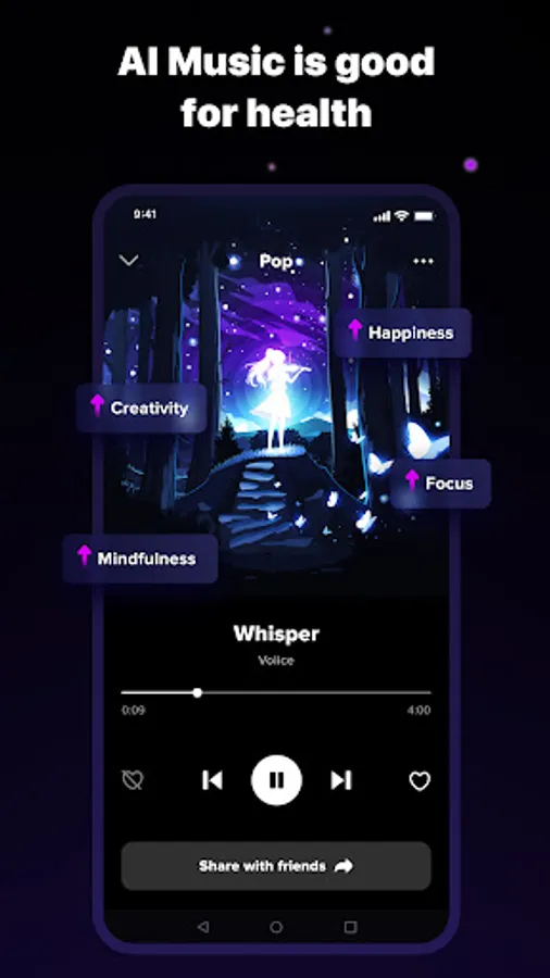 AI Music can help to stay focused, be more productive and even improve creativity. Meditation genre will also assist with stress relief and mindfulness practice.