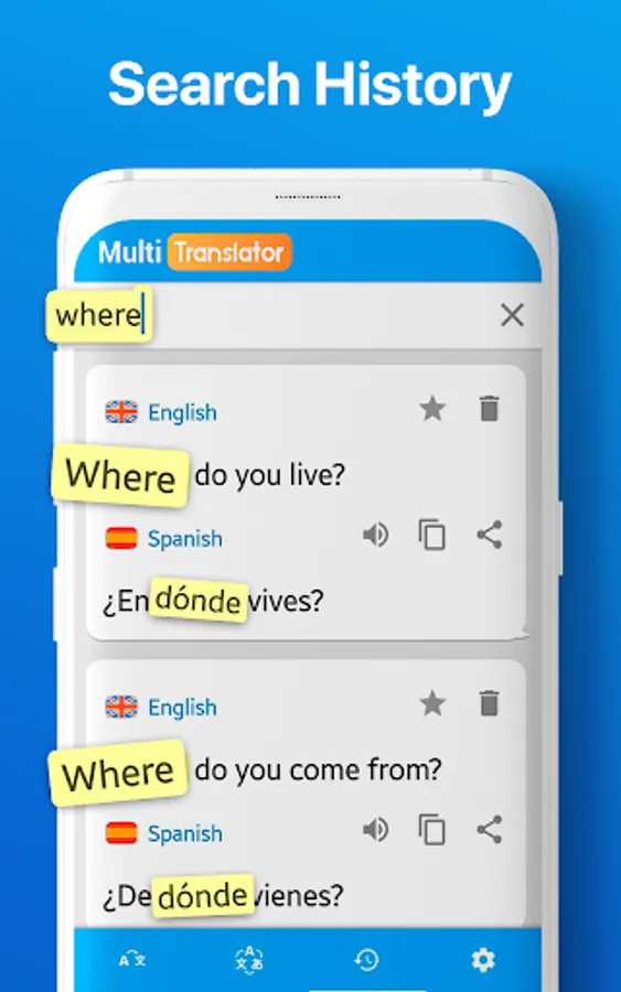 Multi language Translator Text preserves the history of your latest translations, share texts directly to instant messaging, social networking, mail, search engine, notes and other applications you have installed.