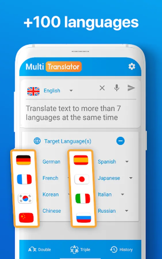 Multiple translator: Translate your text in more than one language easily. You can translate sentences in several languages. Translate to many languages at once. You have only to select how many languages you want to translate to. Translate words in multiple languages in a easy and fast way.