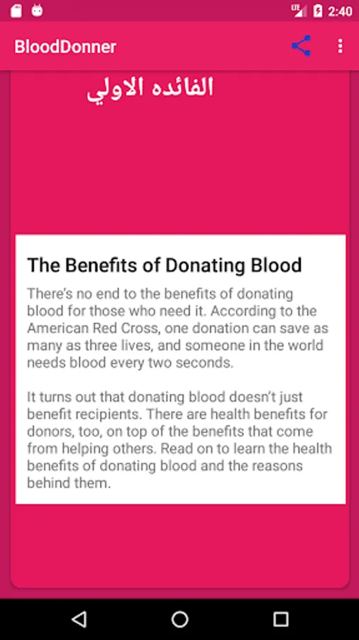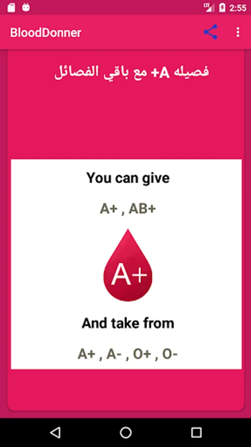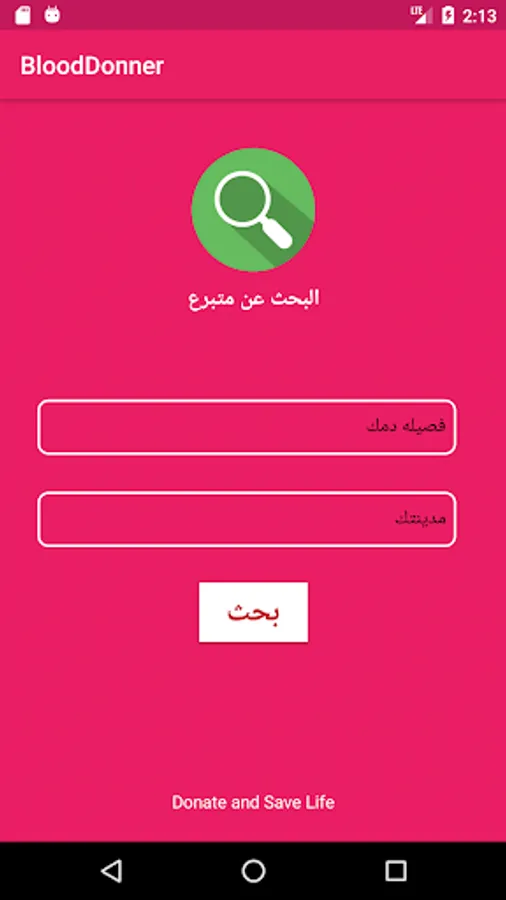 A charitable application for blood donation The donor will register on the application his data and details of his blood type and the time when he can donate and when someone needs a blood donor he searches for the type of blood type he wants and determines the region in which he is located and then appears to people who match their information the research that is searching About him and then communicate with them and go to the donation and save the patient’s life. The application also provides a set of information about all blood types and the factions from which the patient can receive and some information about the importance of donating blood and its benefits to the donor in terms of health and humanity.