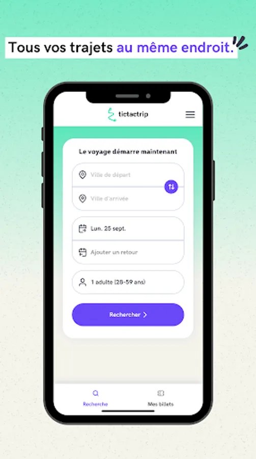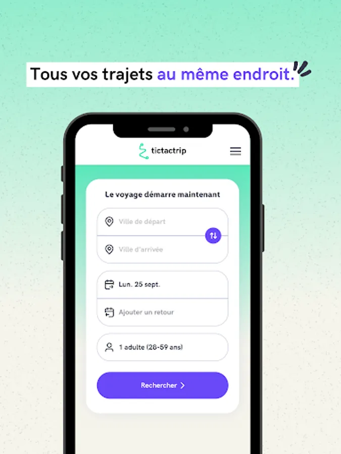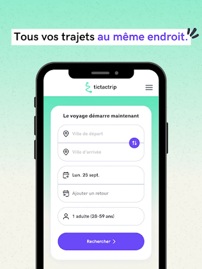 You can finally find all SNCF offers (Ouigo, TGV, Inoui, TER), Flixbus, Bus Blablacar, Blablacar, Thalys and much more on the Tictactrip booking app.
