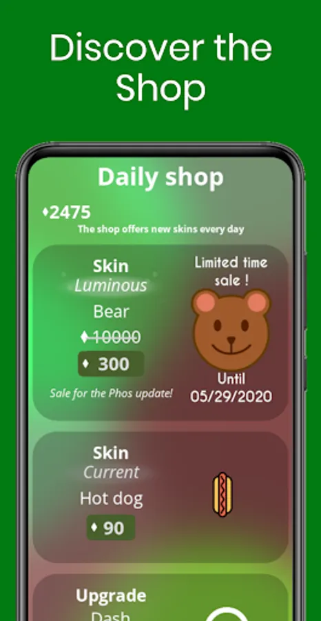 During the game, collect as many coins as possible to get avatars. These allow you to customize the character, your way: you choose the body and the pointer. The store offers new ones every day, and the prices change according to the rarity: Current, Rare, Precious, Divine and Luminous. Can you get them all?