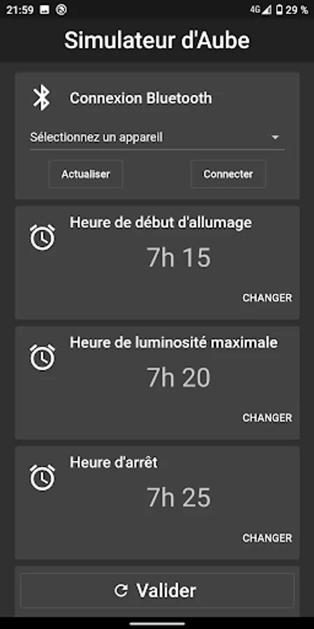 This application was created by T. Danneels with Flutter to control a dawn simulator working with an Arduino board. A dawn simulator is an alarm clock operating in the light: the light intensity allows the user to wake up. Here, the intensity of the light increases linearly, from the time of start of ignition until the hour of maximum intensity. Then it remains constant until the stop time.