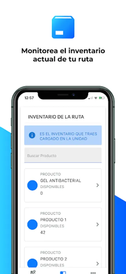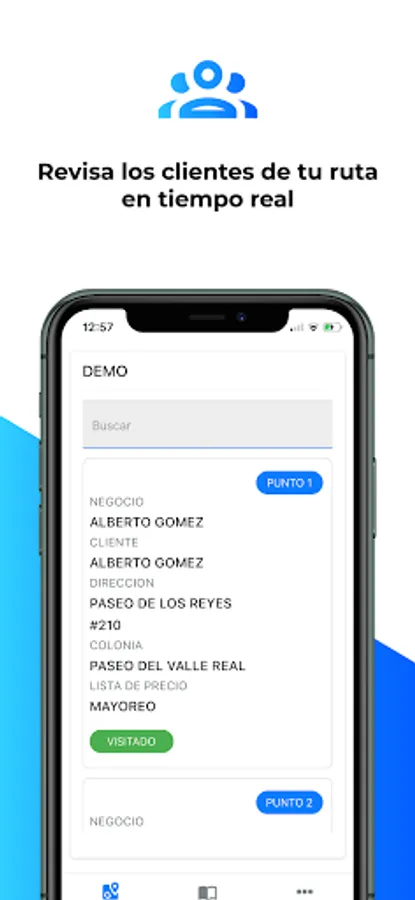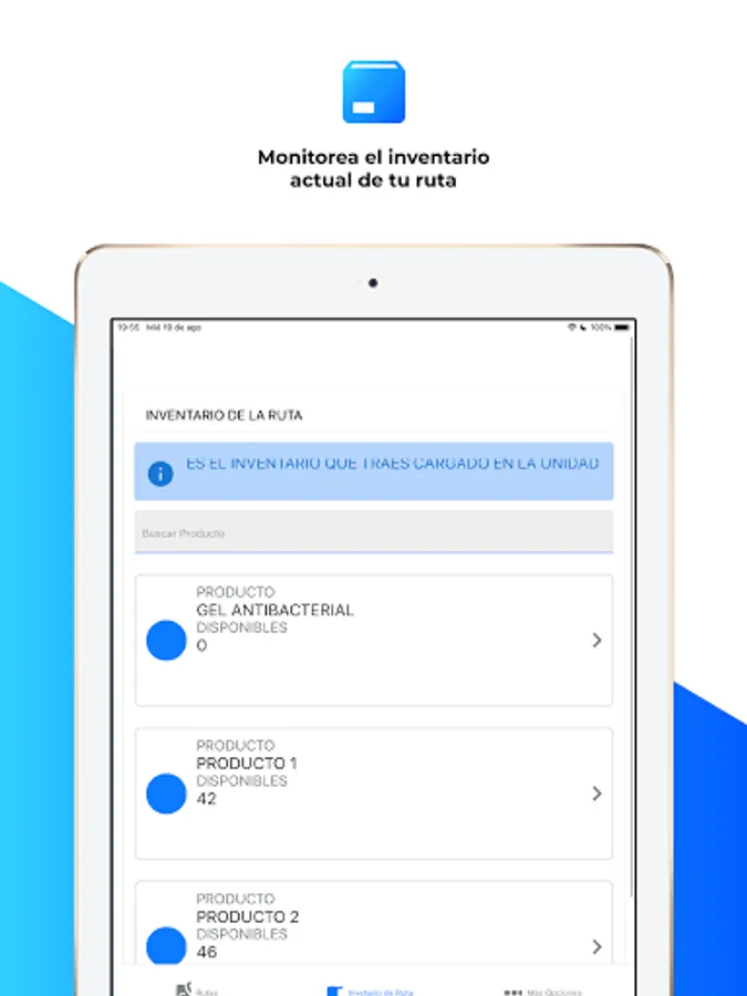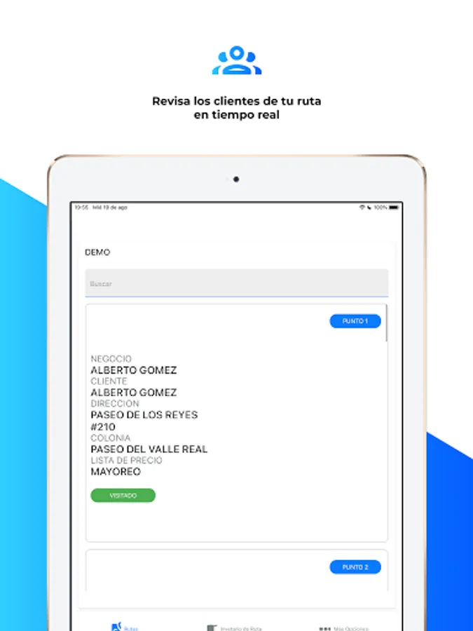 Mobile support tool en route for the seller, where he observes the points of visit, inventory, cuts, customer logistics, record of losses and deliveries. Part of a complex and more complete logistics system, which you can find at https://logistica.tidingo.com