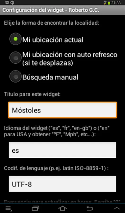 It allows you to zone in to your current location and displays the above-mentioned information. Also it refreshes the location with the frequency (in hours) that you have configured. You can set the wished frequency, even “0”, that means that you prefer manual update. You can manually update your widgets one by one or all at the same time.