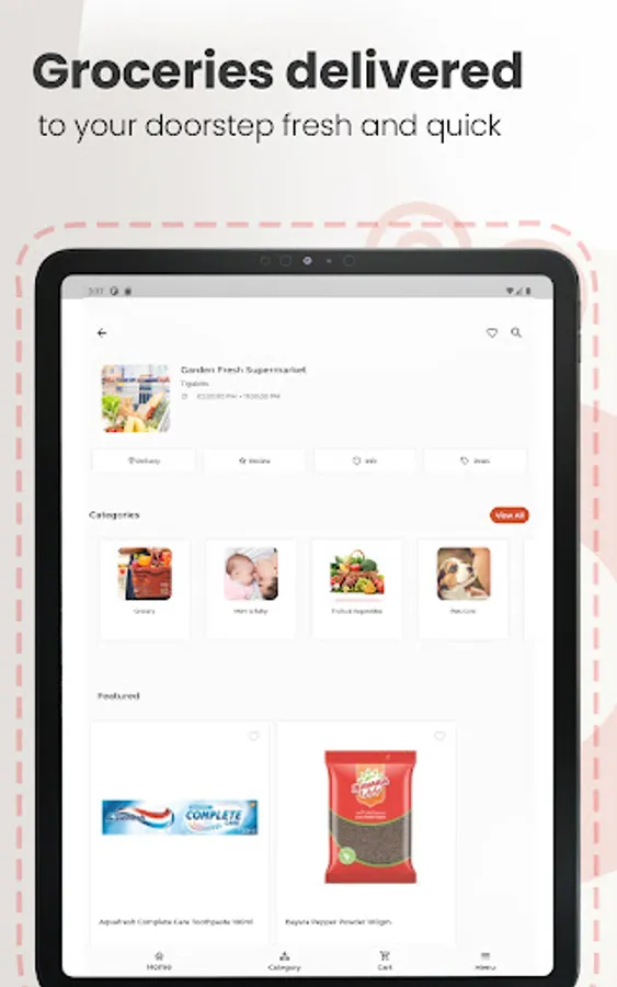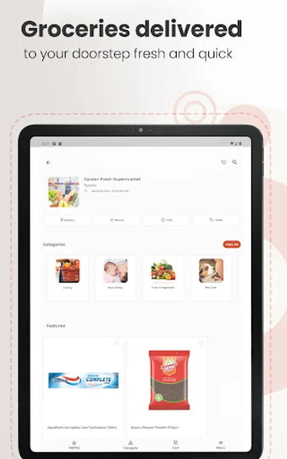 You can choose from a variety of products, staples, veg and fruits, fish and meat, snacks and beverages, packaged food, personal and baby care,