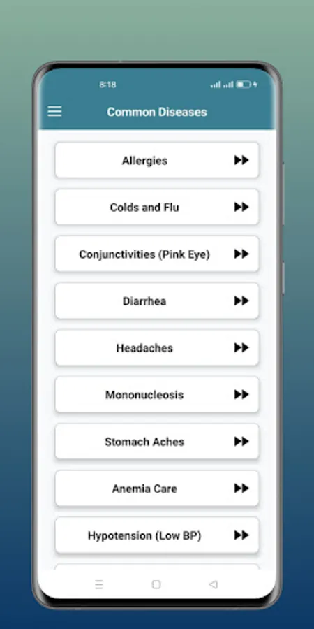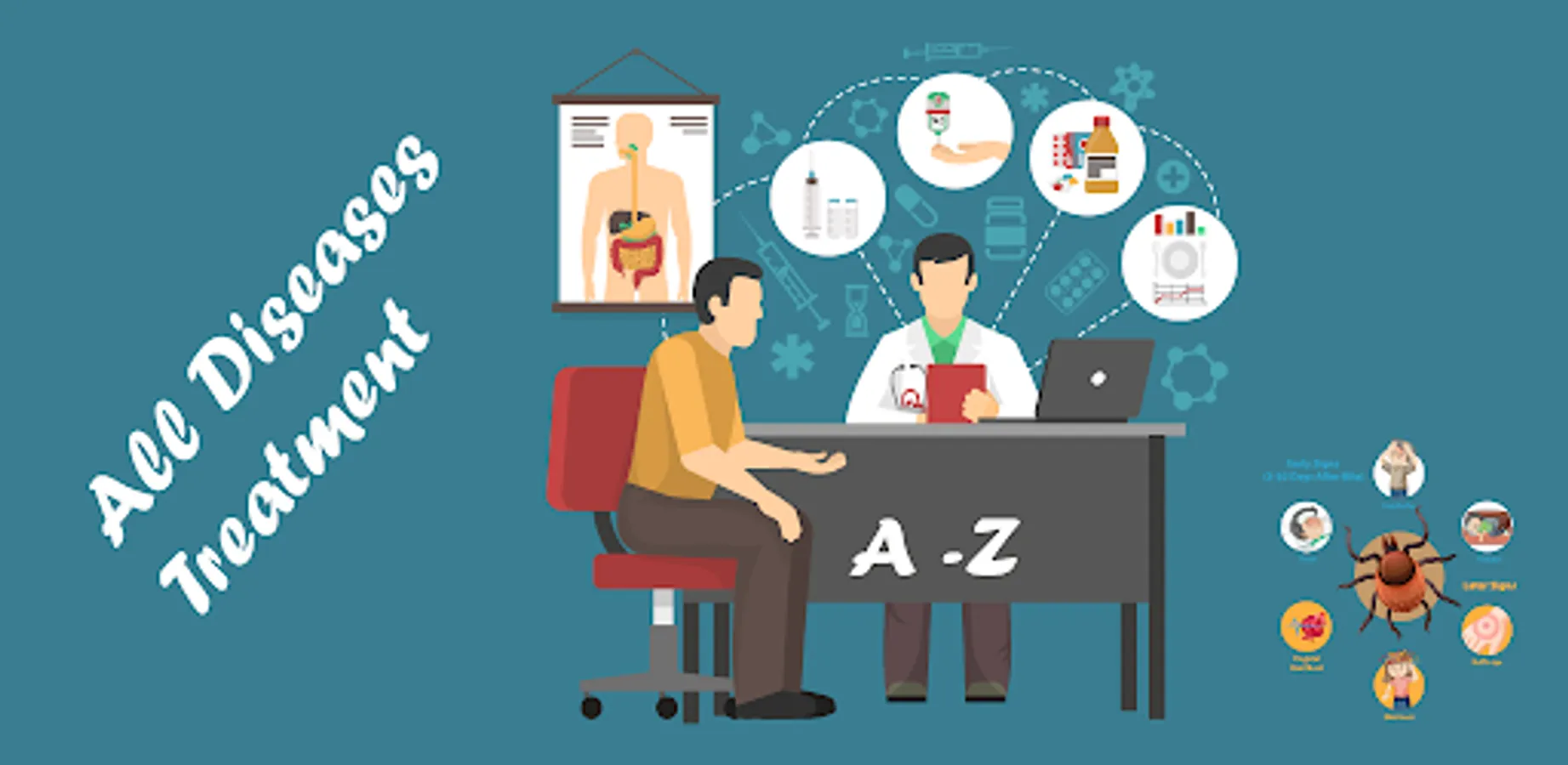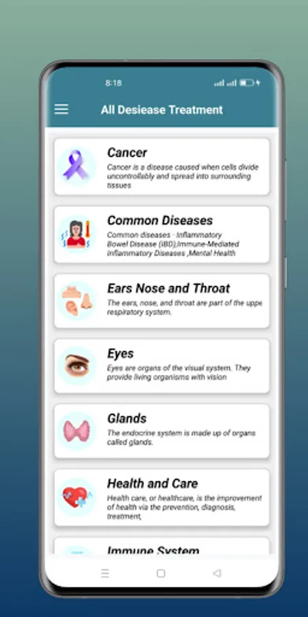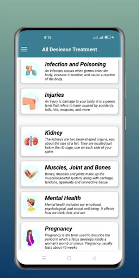 All Diseases Treatments included completed details of any diseases symptoms and treatment information complete solution to read all diseases treatments through this app. All major categories relevant to diseases including common diseases, health and care, viruses, mental health, ear, nose and throat relevant diseases, cancer, infection and poisoning, injuries, pregnancy relevant complications, eyes relevant and almost every part of body relevant diseases are added. All common diseases including allergies, cold and flu, diarrhea, headaches, hepatitis, and their types are included. Symptom Check Select symptoms, learn about possible illnesses or problems, and find treatment and care options. Conditions Find medical information about conditions that interest you and learn about causes, treatment and associated symptoms.