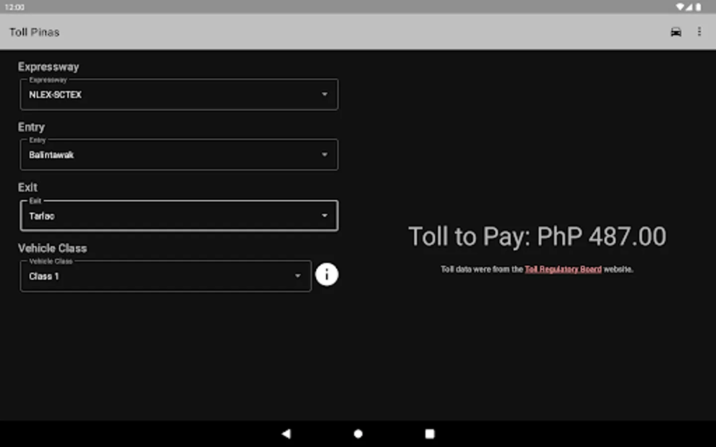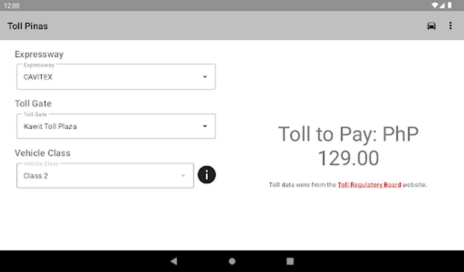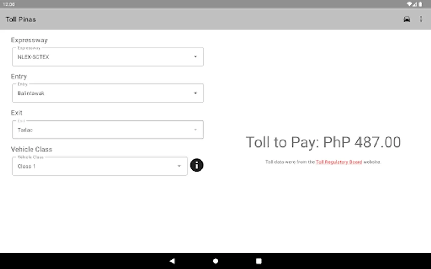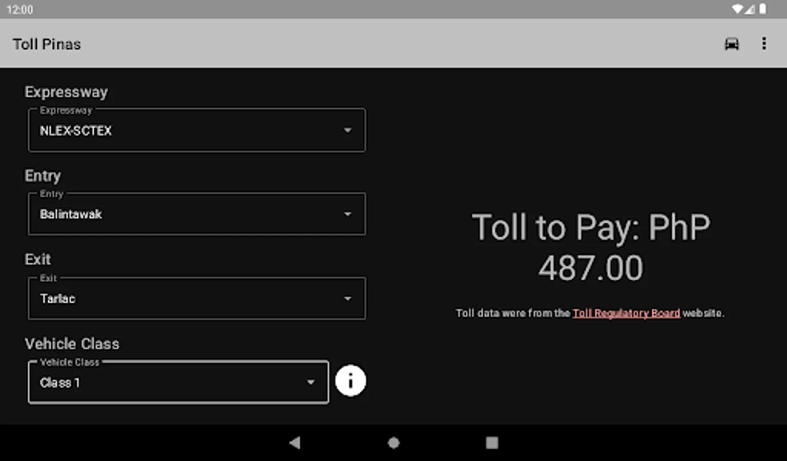 Toll Pinas is an app that you can use to find out the toll (known locally as toll fee) you need to pay for expressways in the Philippines.