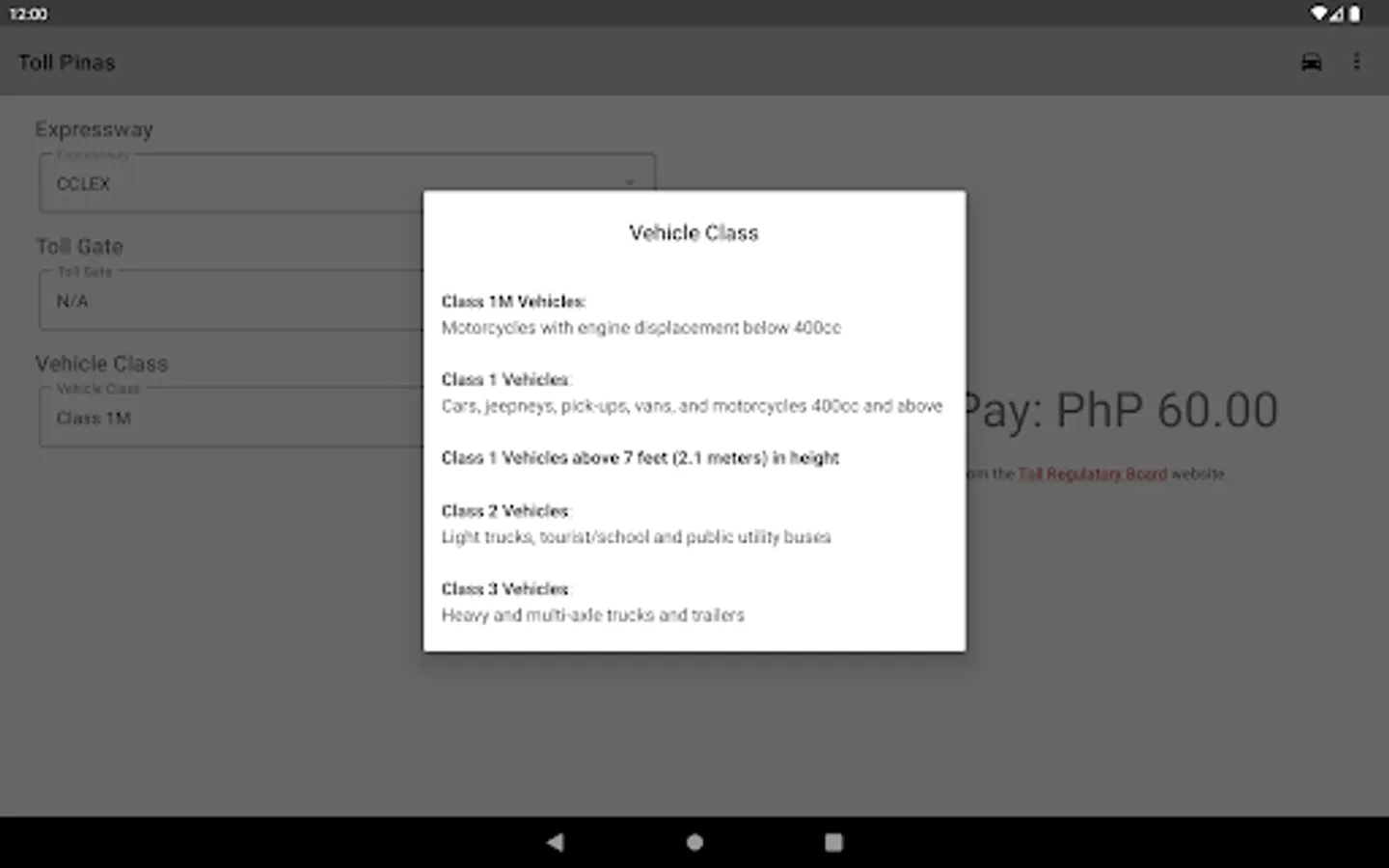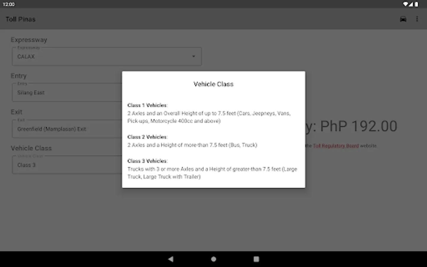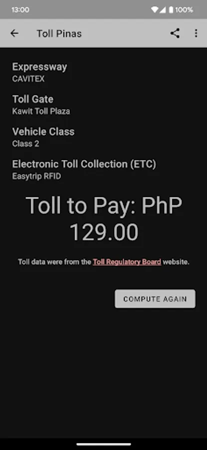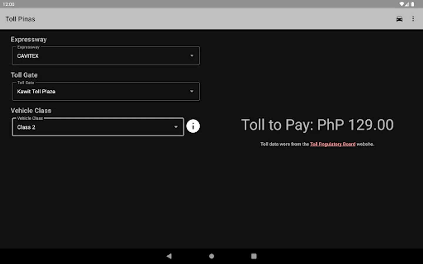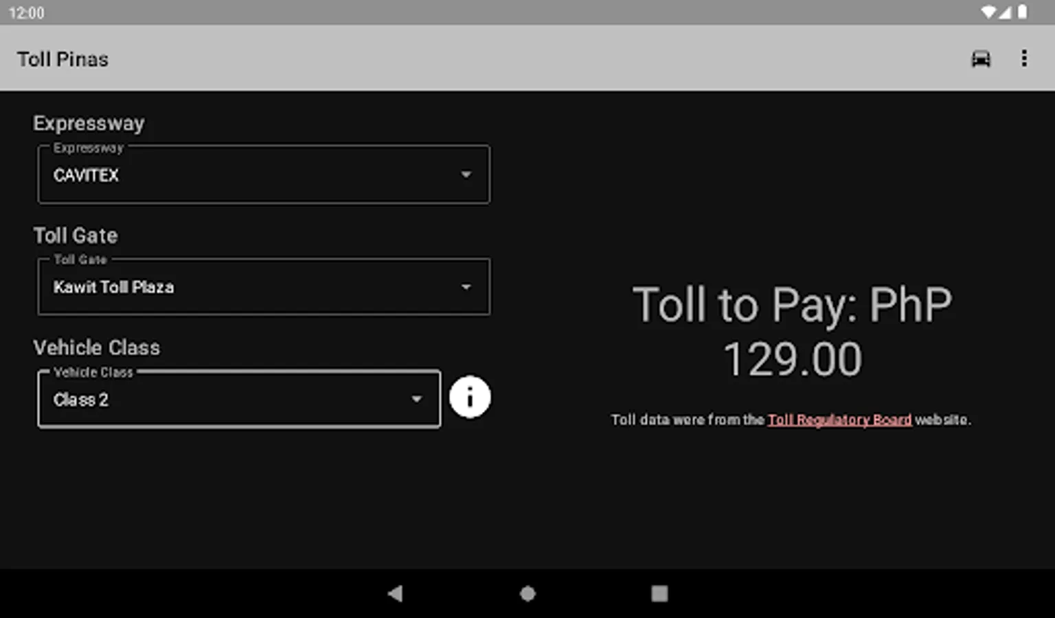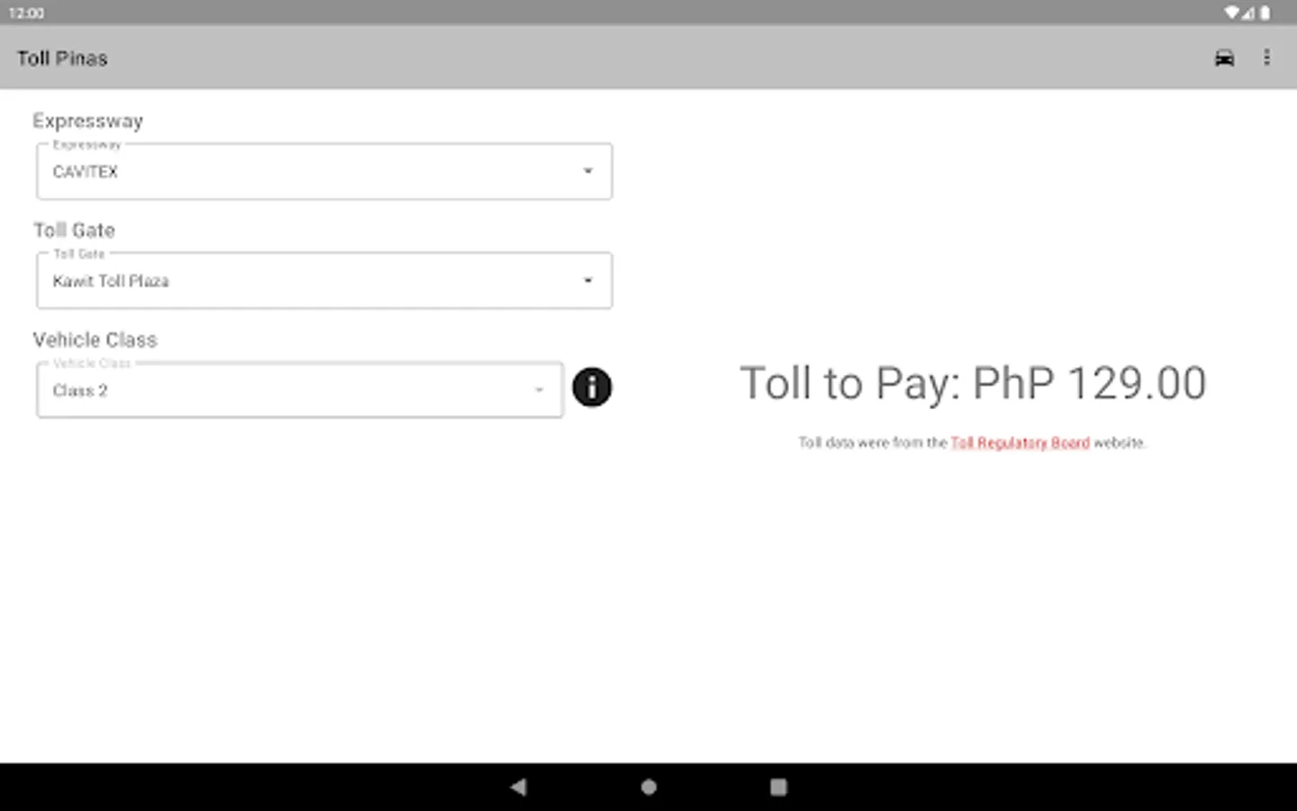 Toll Pinas is an app that you can use to find out the toll (known locally as toll fee) you need to pay for expressways in the Philippines.