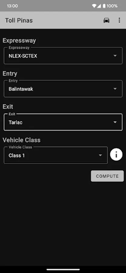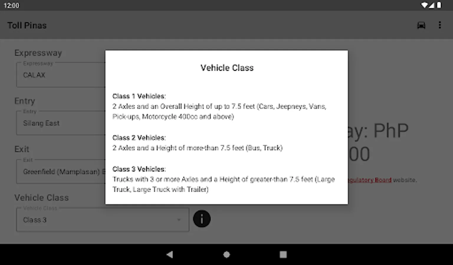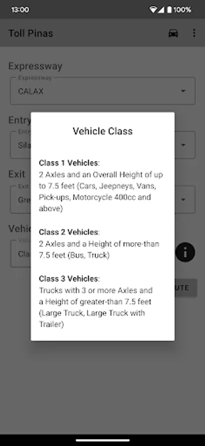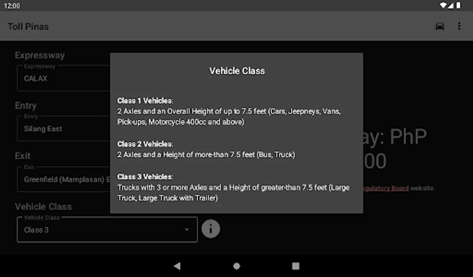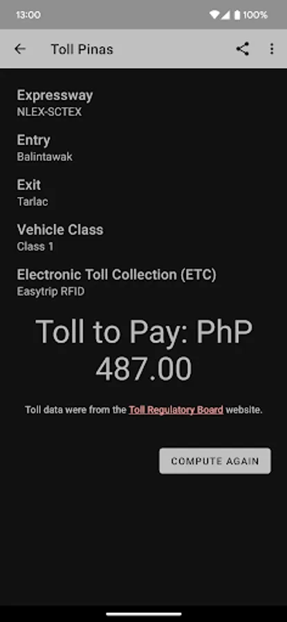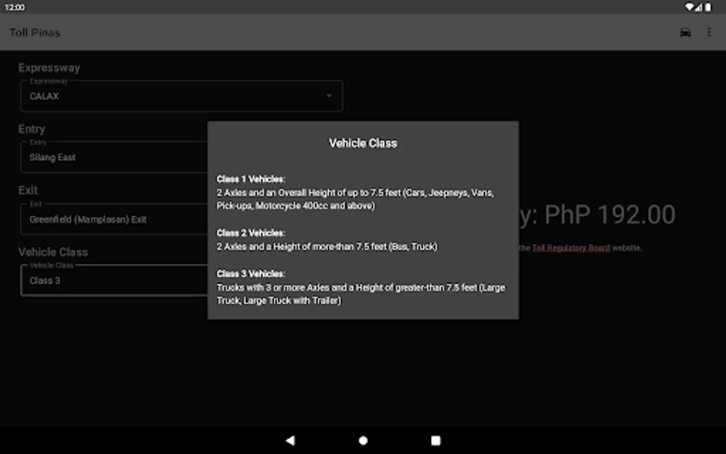 Toll Pinas is an app that you can use to find out the toll (known locally as toll fee) you need to pay for expressways in the Philippines.