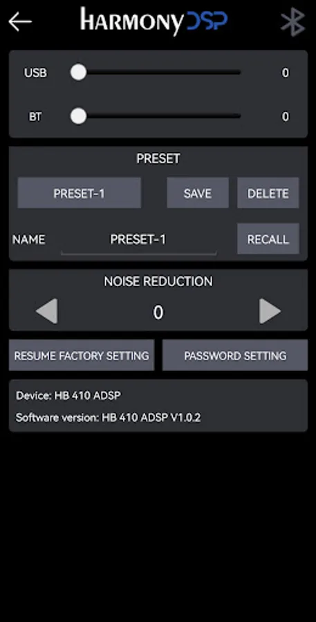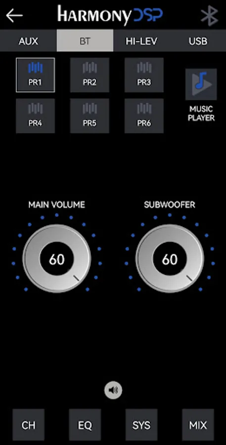 In the main screen you will find the Input Source menu where you can choose BT, HI-LEV, USB and AUX. Here you also find Presets (saved into your device) to choose from, you access the Music Player, you have the Main and Subwoofer Volume, and the Advanced menu with Channels, EQ, System and Mixing.