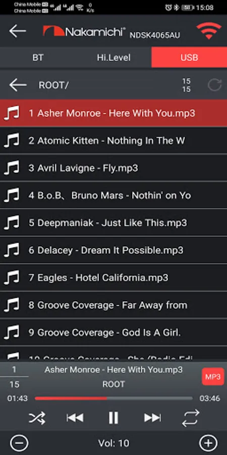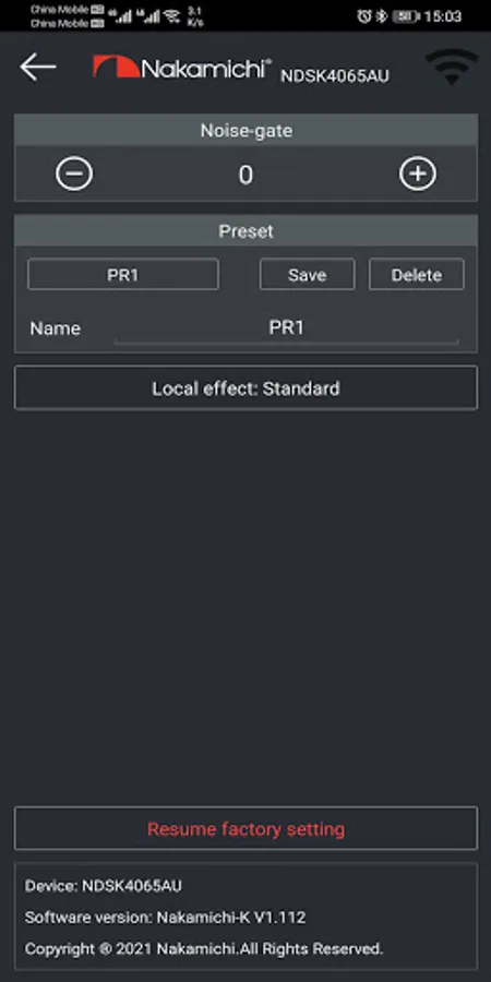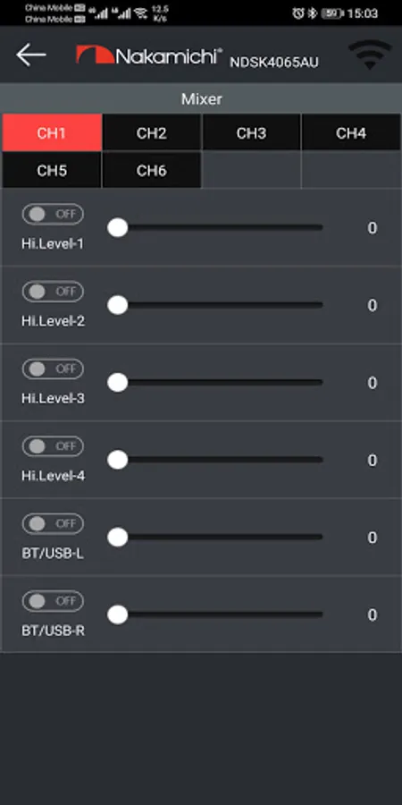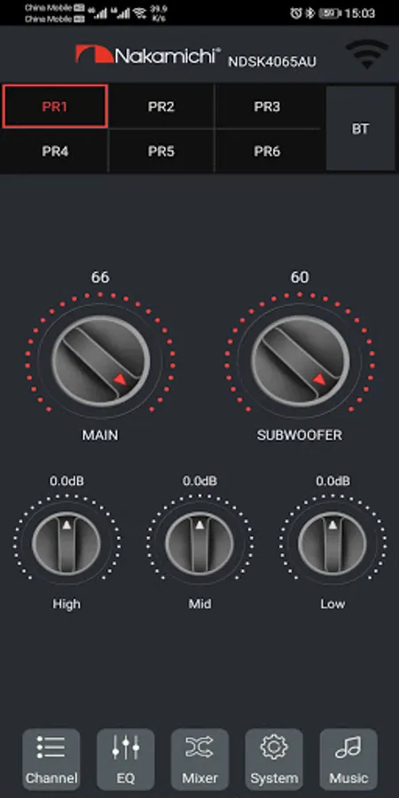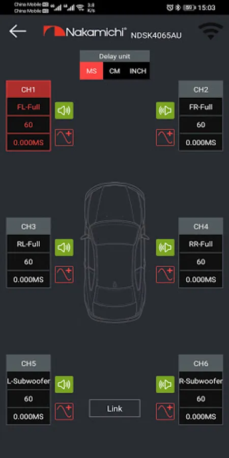 The Nakamichi mobile phone NDSK DSP APP connects with NDSK4064AU/NDSK4165AU/NDSK4085AU/NDSK4185AU by utilizing a wireless bluetooth interface for superior DSP control