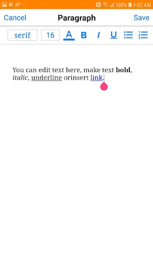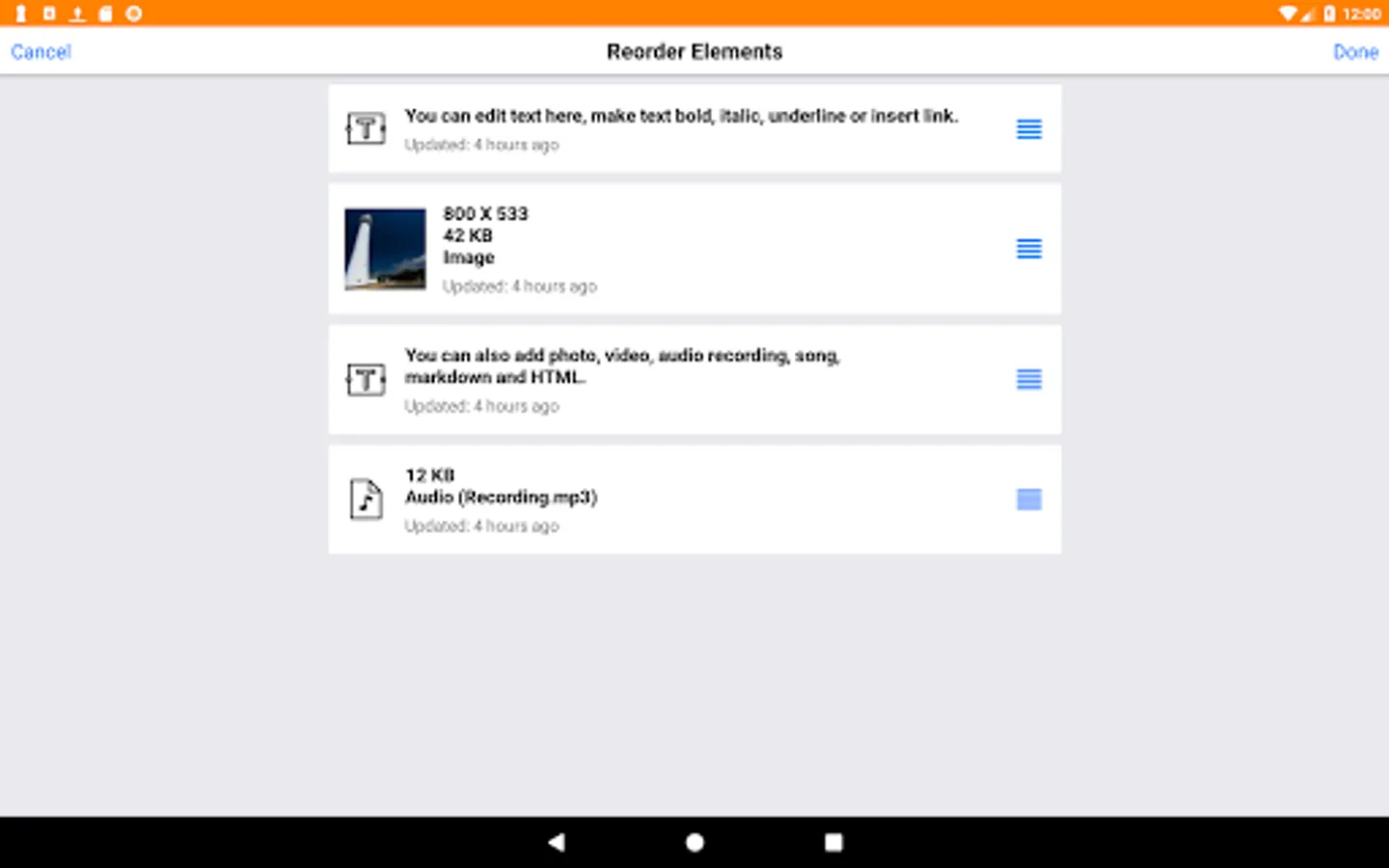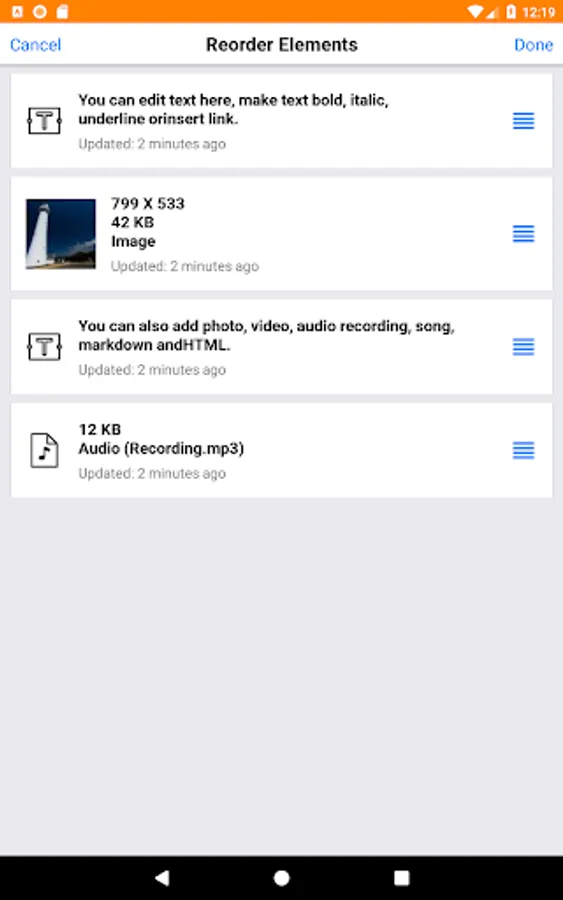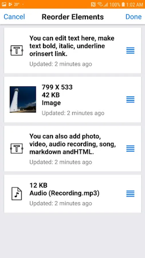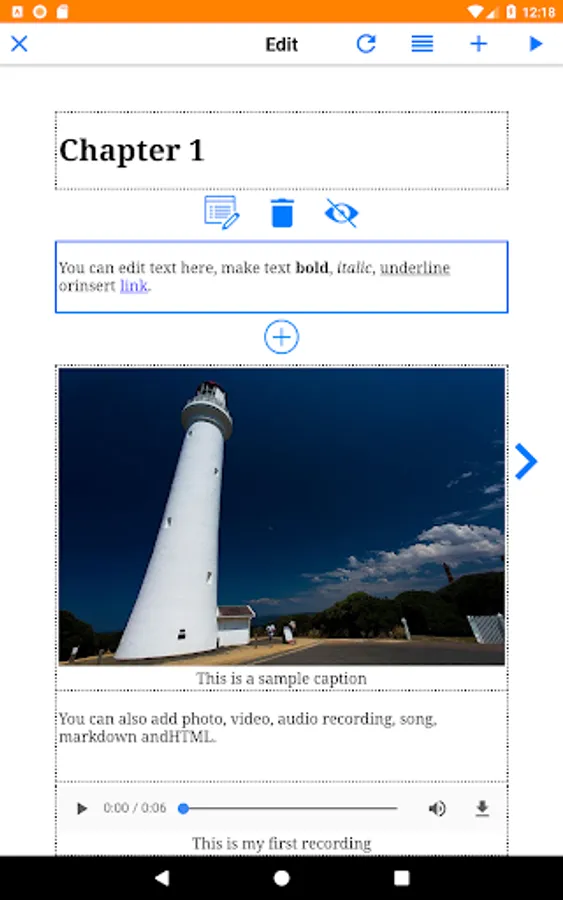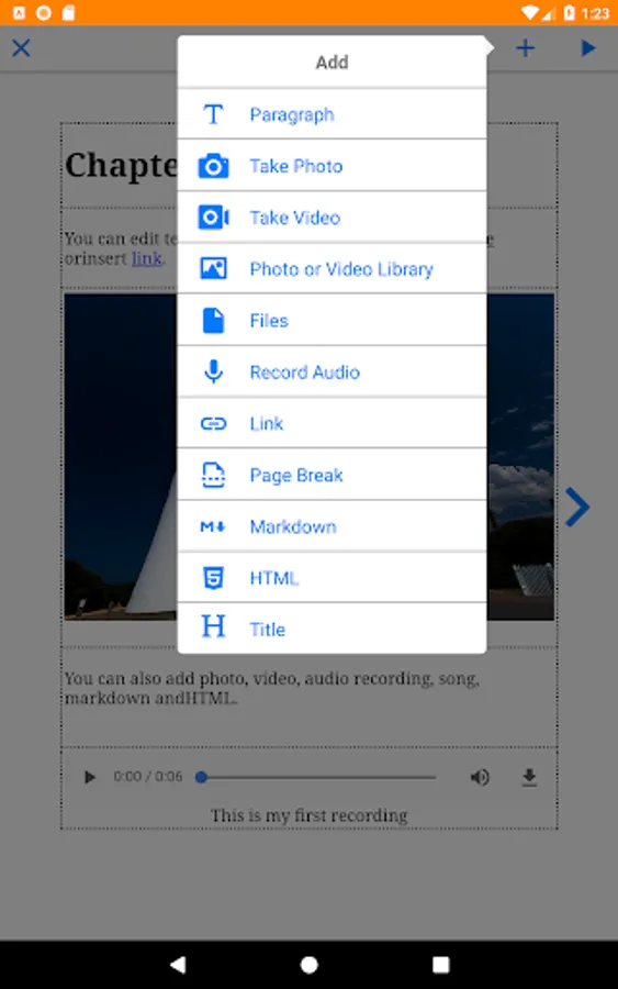 ★ Add title, paragraph, images, videos, links, audio recording & custom HTML