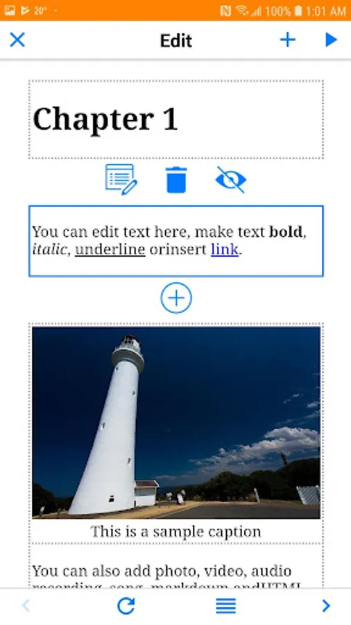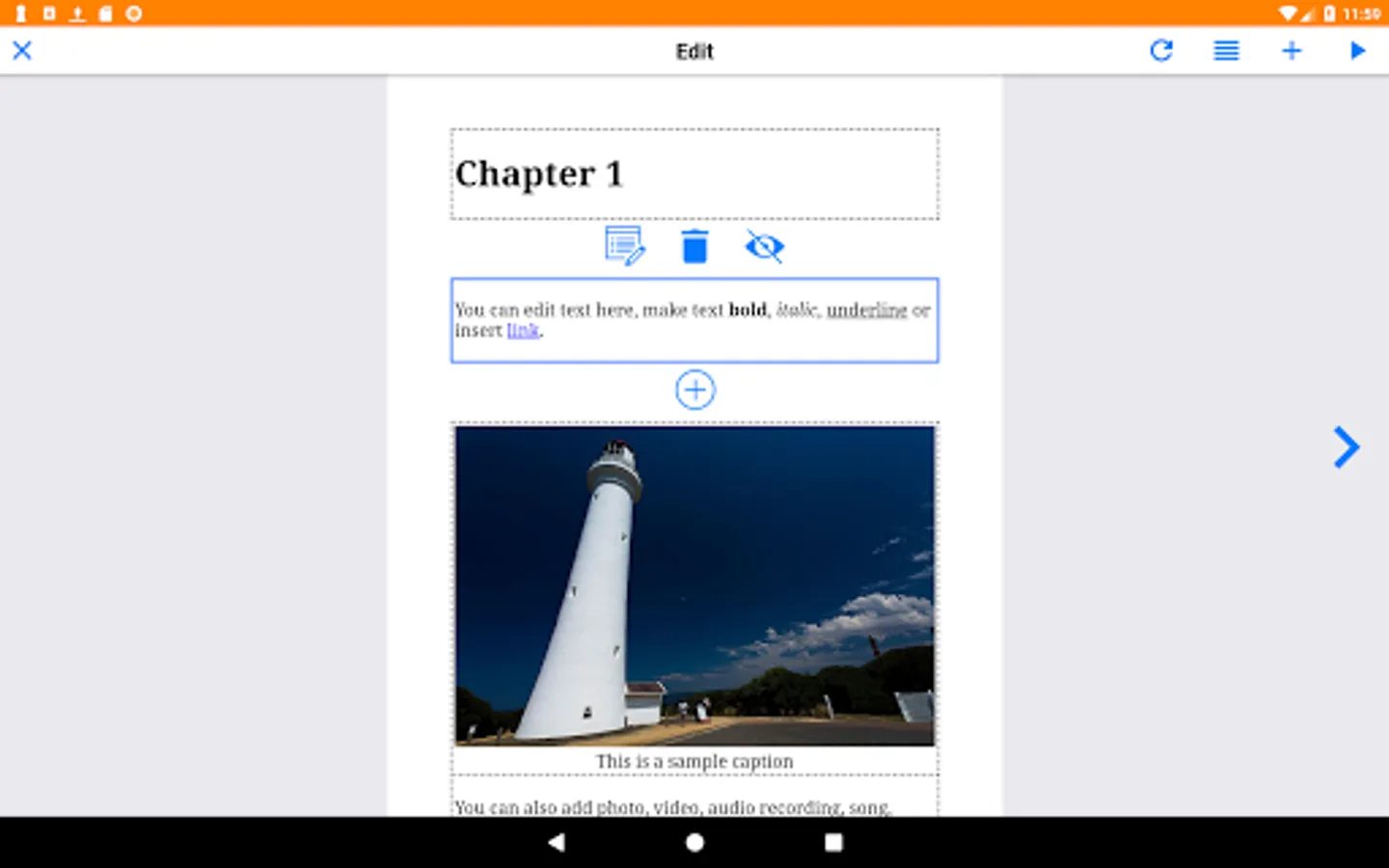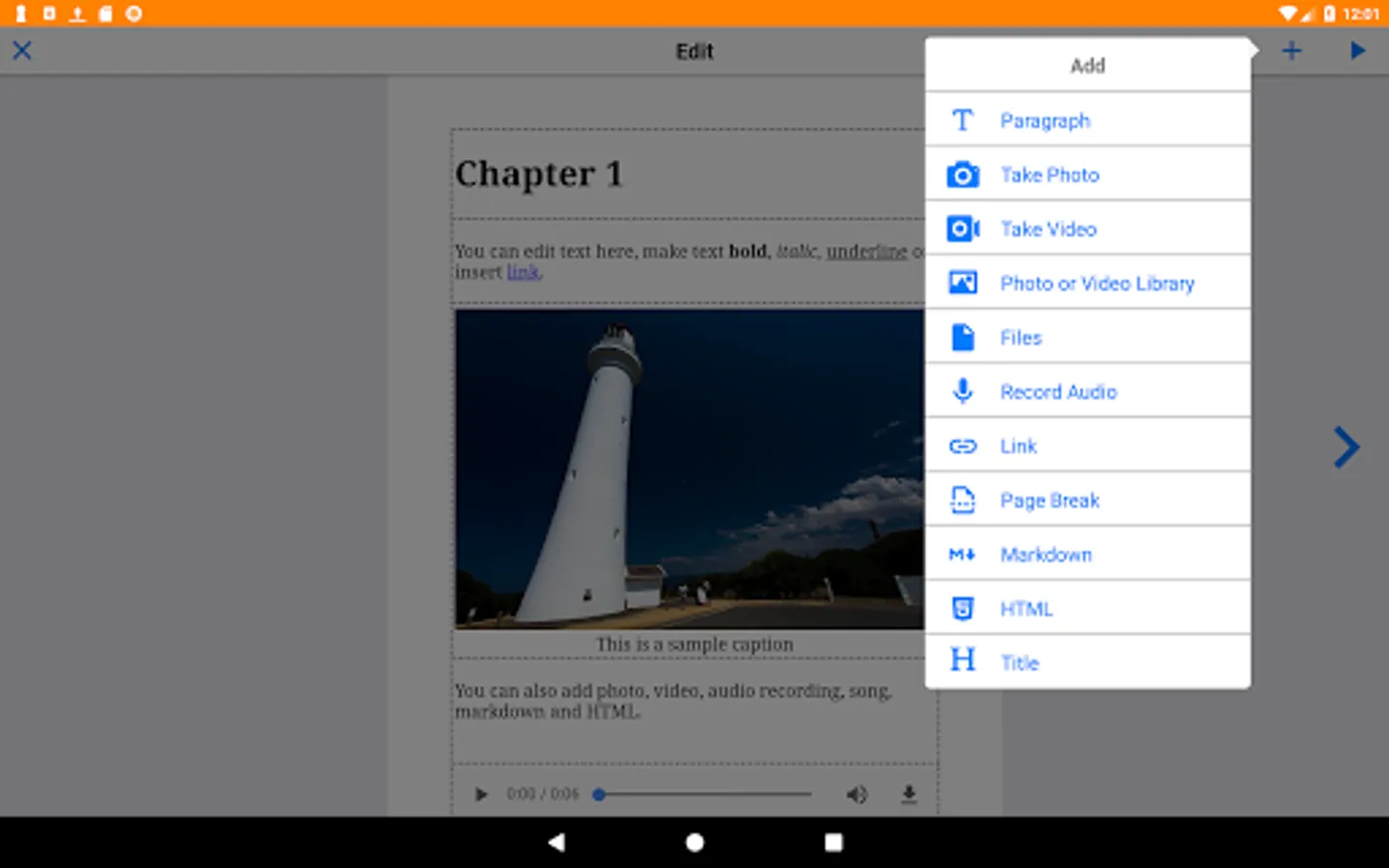 Creative Book Builder for Android enables everyone to create, edit and publish ebooks in a few minutes on the go. All published ebooks can be read by any ePub readers. Everyone is professional writer now!