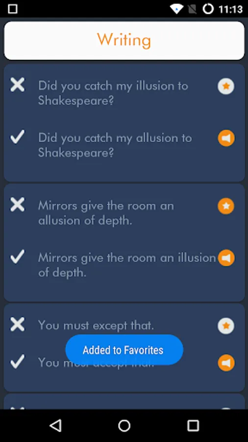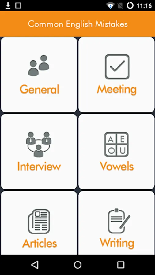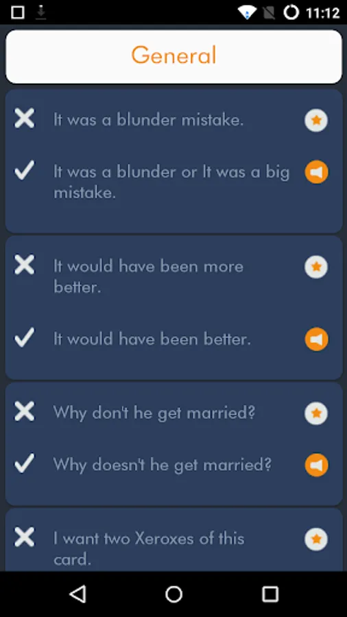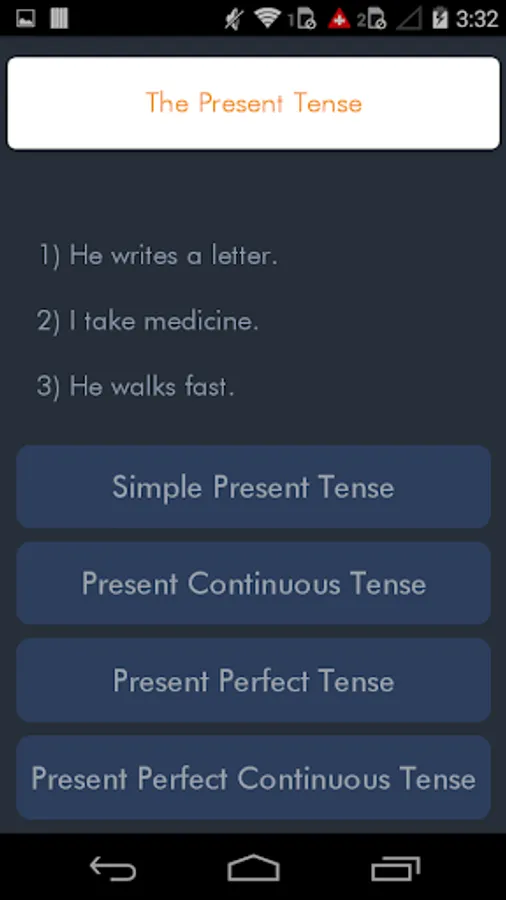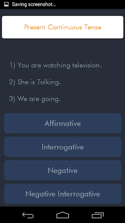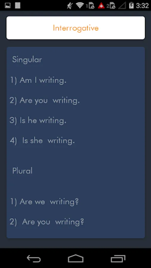 The app provides the standard example sentences in the above types in all the 12 tenses.