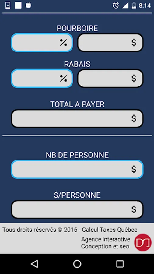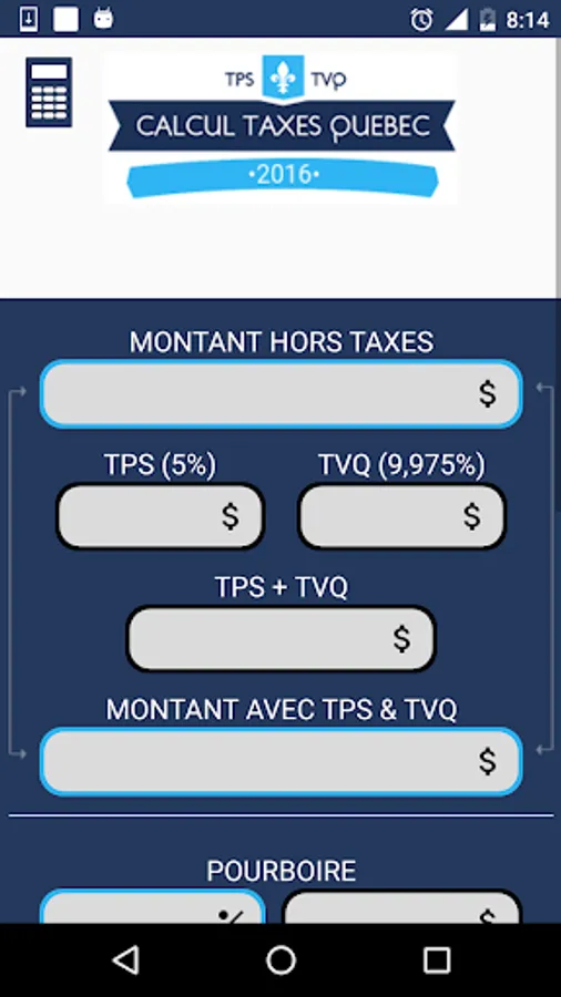 We developed a very simple app to calculate sales tax in Quebec for the year 2013. You can either enter price without or with taxes to figure out its equivalent with or without taxes. The tool is very precise, light and will save you time on a daily basis. We are reading comments and suggestions to improve this app to become a must when one lives in Quebec.