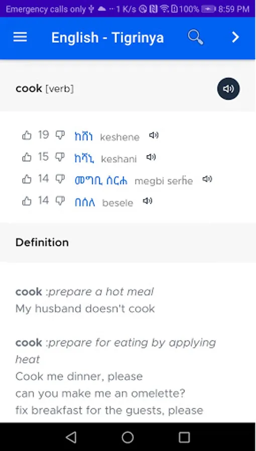 For advanced and complete translation and dictionary, use the website www.geezexperience.com. You can find detailed word definitions, pronunciation audio, similarities and reverse translation. It also supports other languages such as German, Dutch and more.