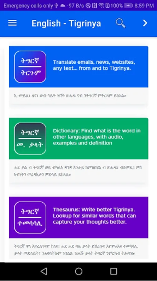 This app is a quick and convenient way to access Tigrinya translate and dictionary from geezexperience.com. The app is designed to be fast and uses very little internet data usage.