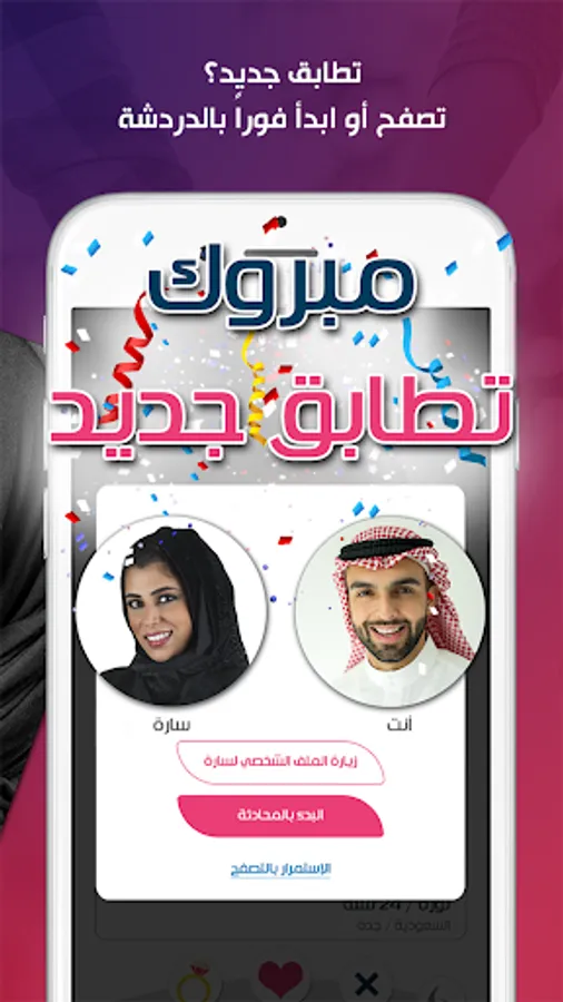 • مع بحث المستخدمين الآخرين ستتلقى تنبيهًا بكل تطابق جديد، لتتمكن من تصفح الملف الشخصي للمُطابق وتنتقل للمحادثة أو تكمل البحث والتصفح.