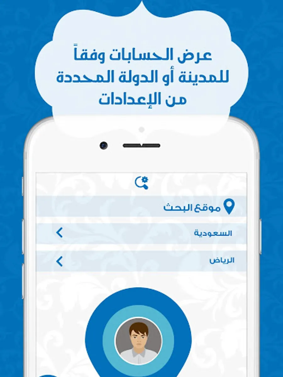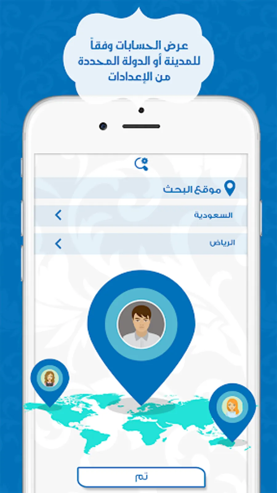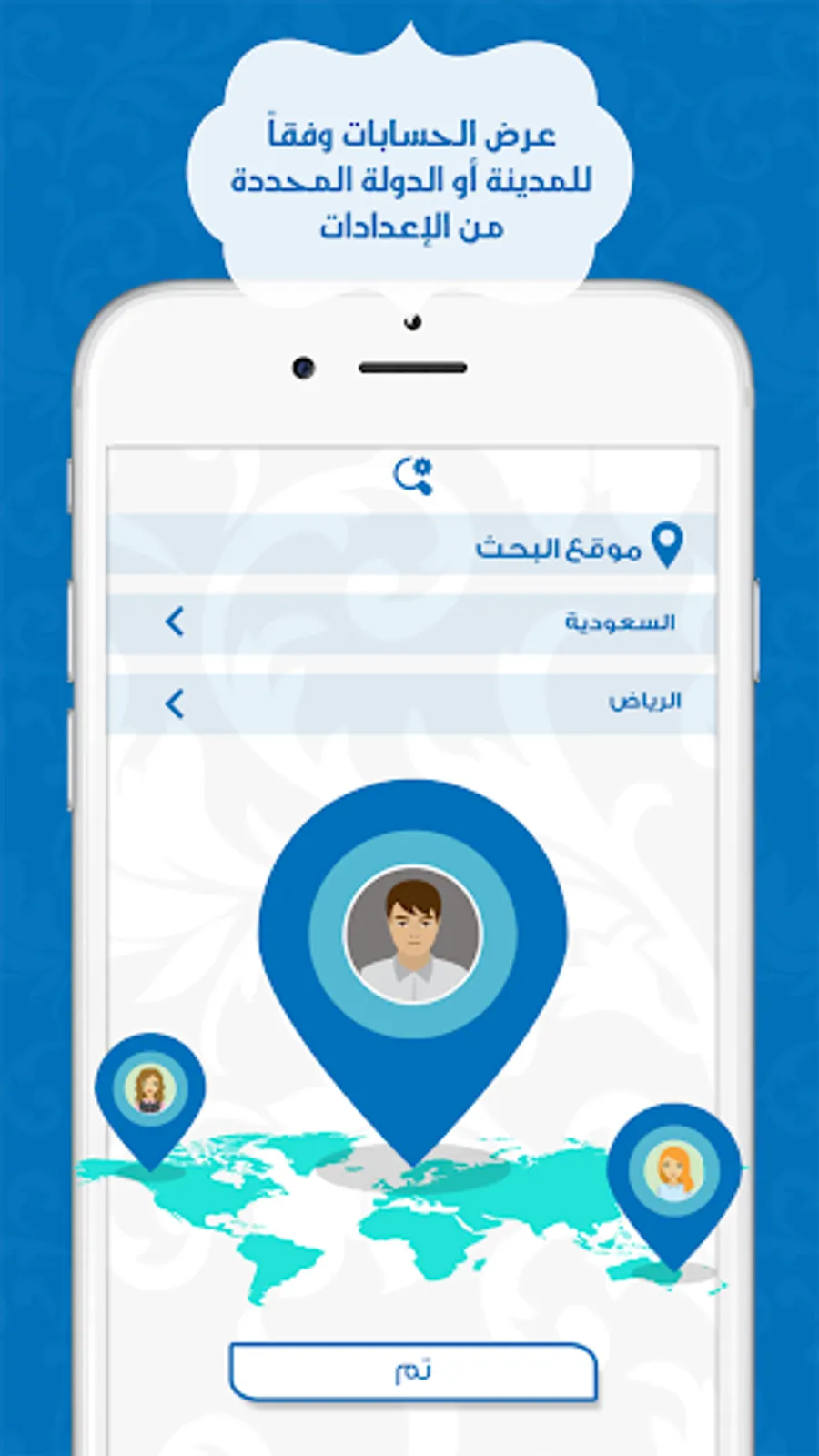 • البحث المتقدم يمكنك من اختيار أن يكون البحث بحسب الموقع الجغرافي مثلاً: (السعودية، الرياض، جدة)، أو أن يكون بحثاً متقدماً بحسب تفضيلاتك ومواصفاتك (البلد، المدينة، العمر، الحالة الاجتماعية، المواصفات الشكلية).