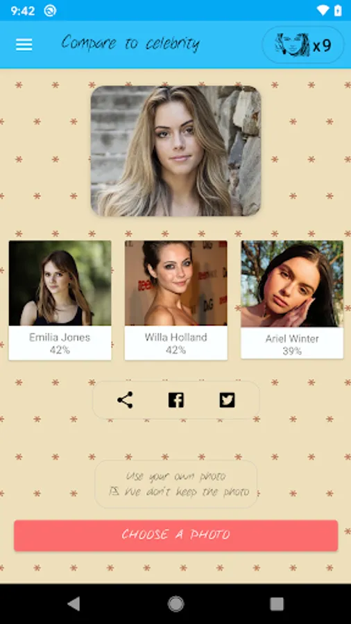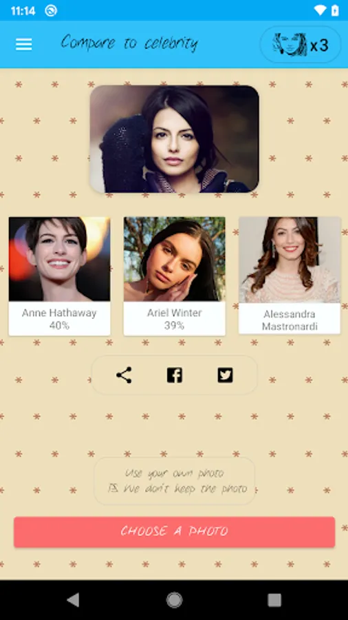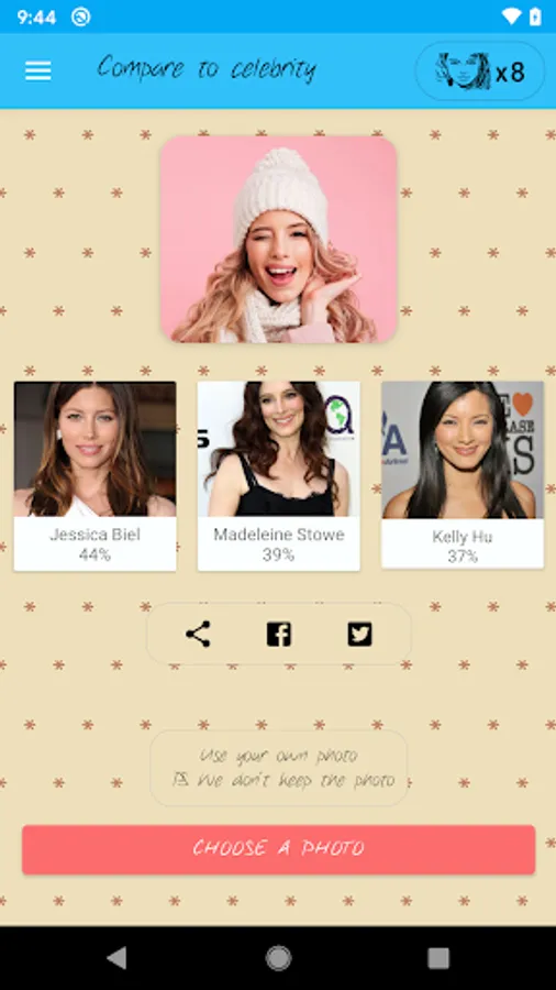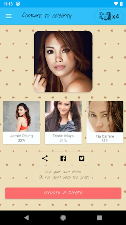 To compare with a star, you can take a photo or download from the gallery. It is better to use those photos in which your face is clearly visible and good lighting is used. Analyzed: eyes, eyebrows, nose, mouth. You can share the results on social networks with your friends.