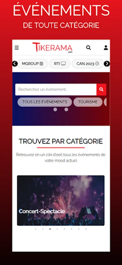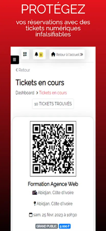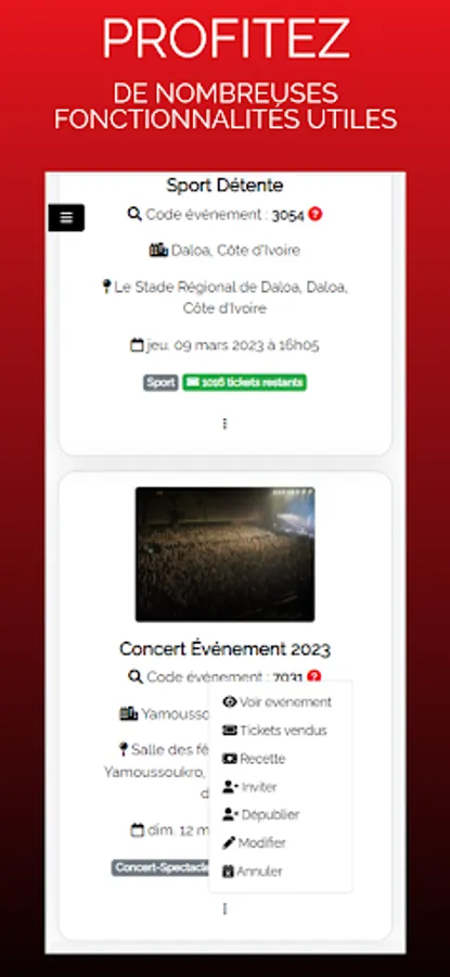 We cover a wide range of events: concerts, festivals, sporting events, tourist events, etc. It is an all-in-one platform, adapted to the Ivorian context and equipped only with useful functionalities.