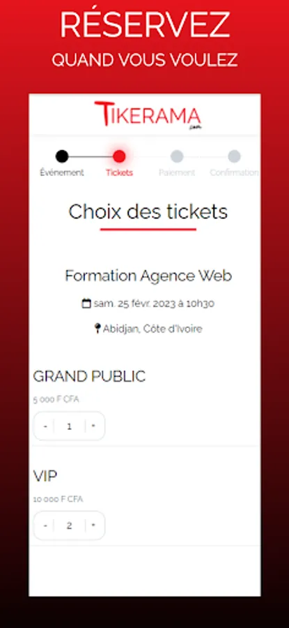 Fast, secure and easy to use, TIKERAMA is the best way to sell and buy tickets for your events in CΓ΄te d'Ivoire. Purchases are possible: