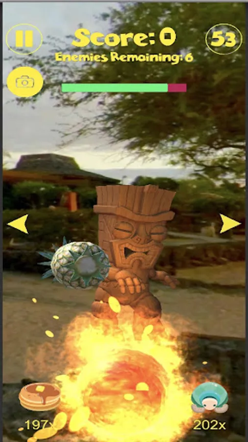 The tikimen are armed and dangerous, and will attack you with pineapples, cherries, bananas and throwing knives. You kill an enemy by hitting it with a lava fireball.