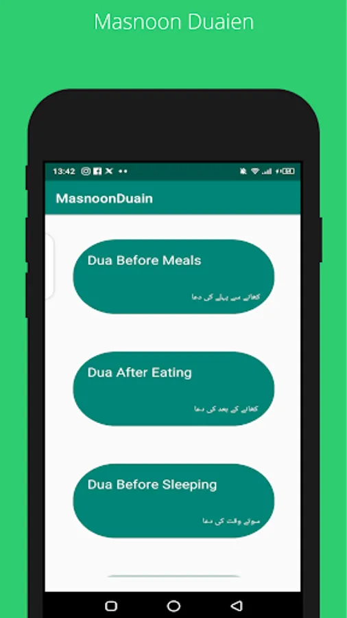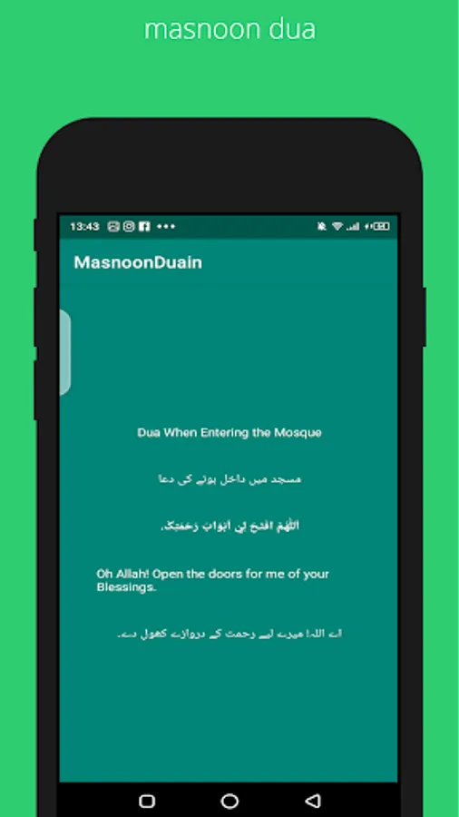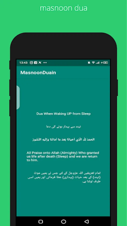 Masnoon Dua contains a list of Islamic dua in Arabic text with Urdu and English translations.