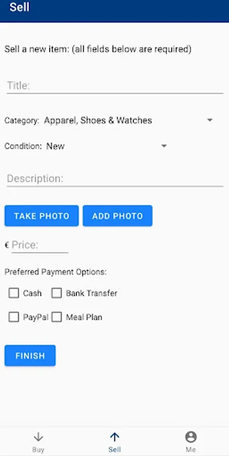 2. Post items with a picture (from gallery or taking a photo inside the app), title, category, condition, description, price, and preferred payment options.