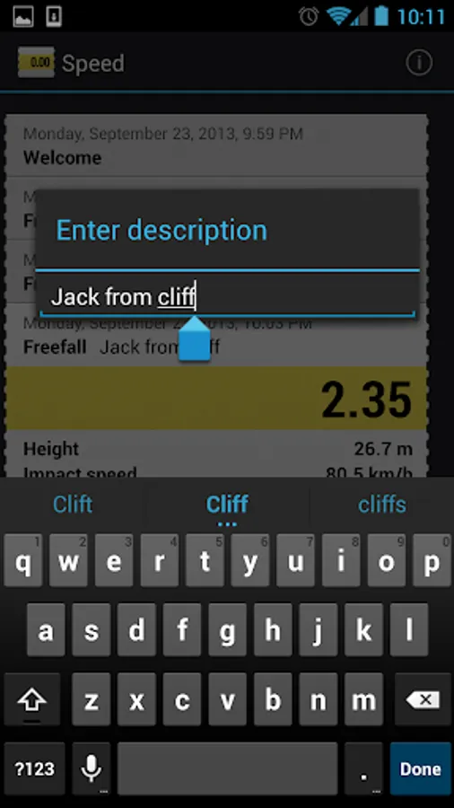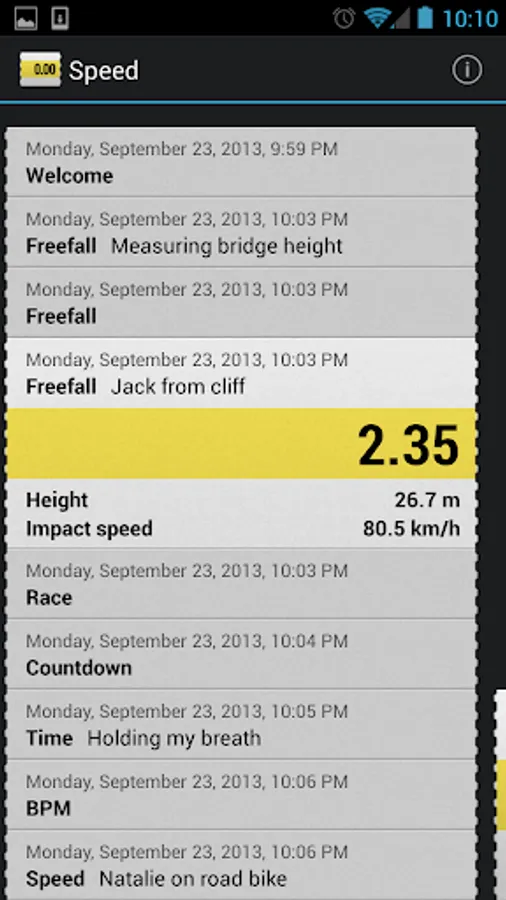 Stopwatch Plus is more than a simple timer. Six different modes are available. Measure speed of people or vehicles (tachymeter). Measure the freefall duration of objects and read fall height and speed in realtime. Quickly and easily measure your heartrate or beats per minute by simple tapping. Of course the usual stopwatch modes are there as well. Everything you measure is saved in the log - great for keeping track of your training progress or remembering your highest dive. You can add descriptions to saved events and send them by email.