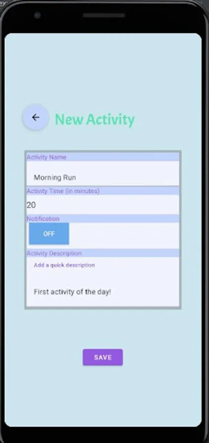 Create new activities by clicking "add activity", and enter name, details as well as how much time you are planning to spend on it.