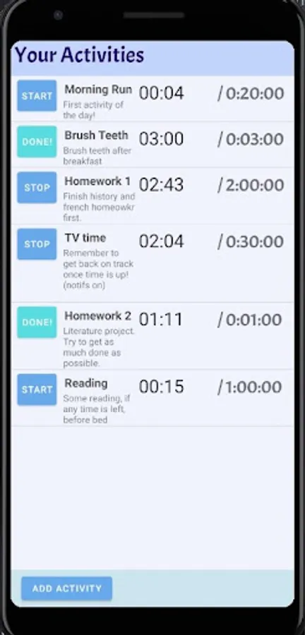 Once you are done, your activity will be added to the list, showing you how much time you have left.