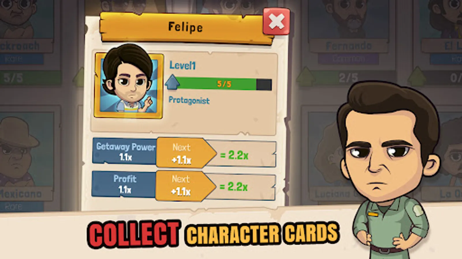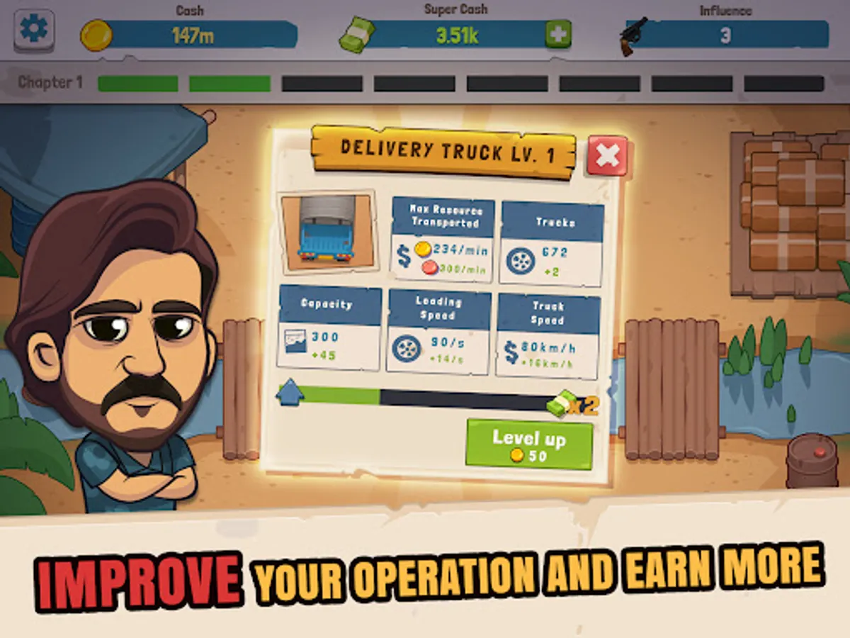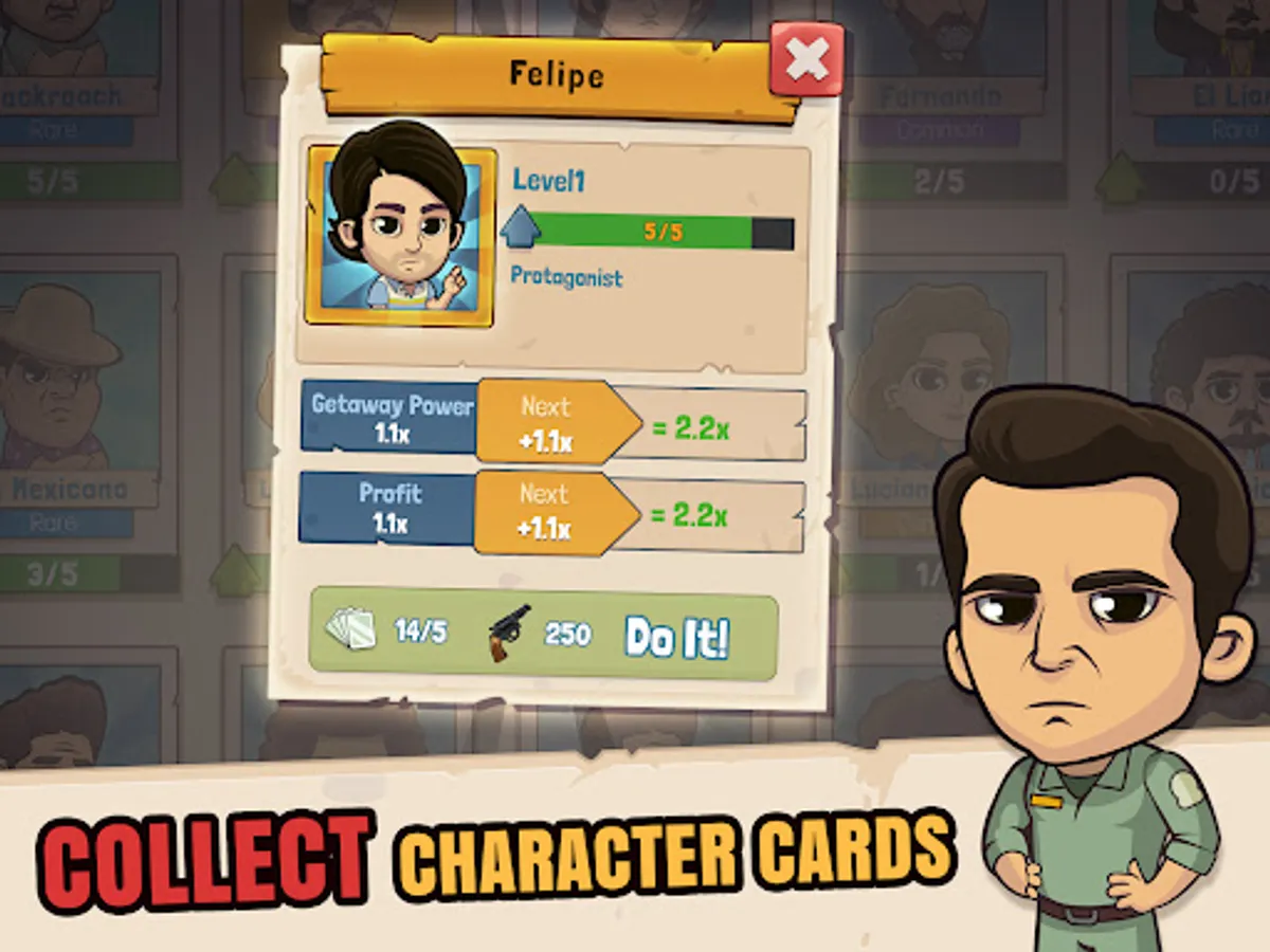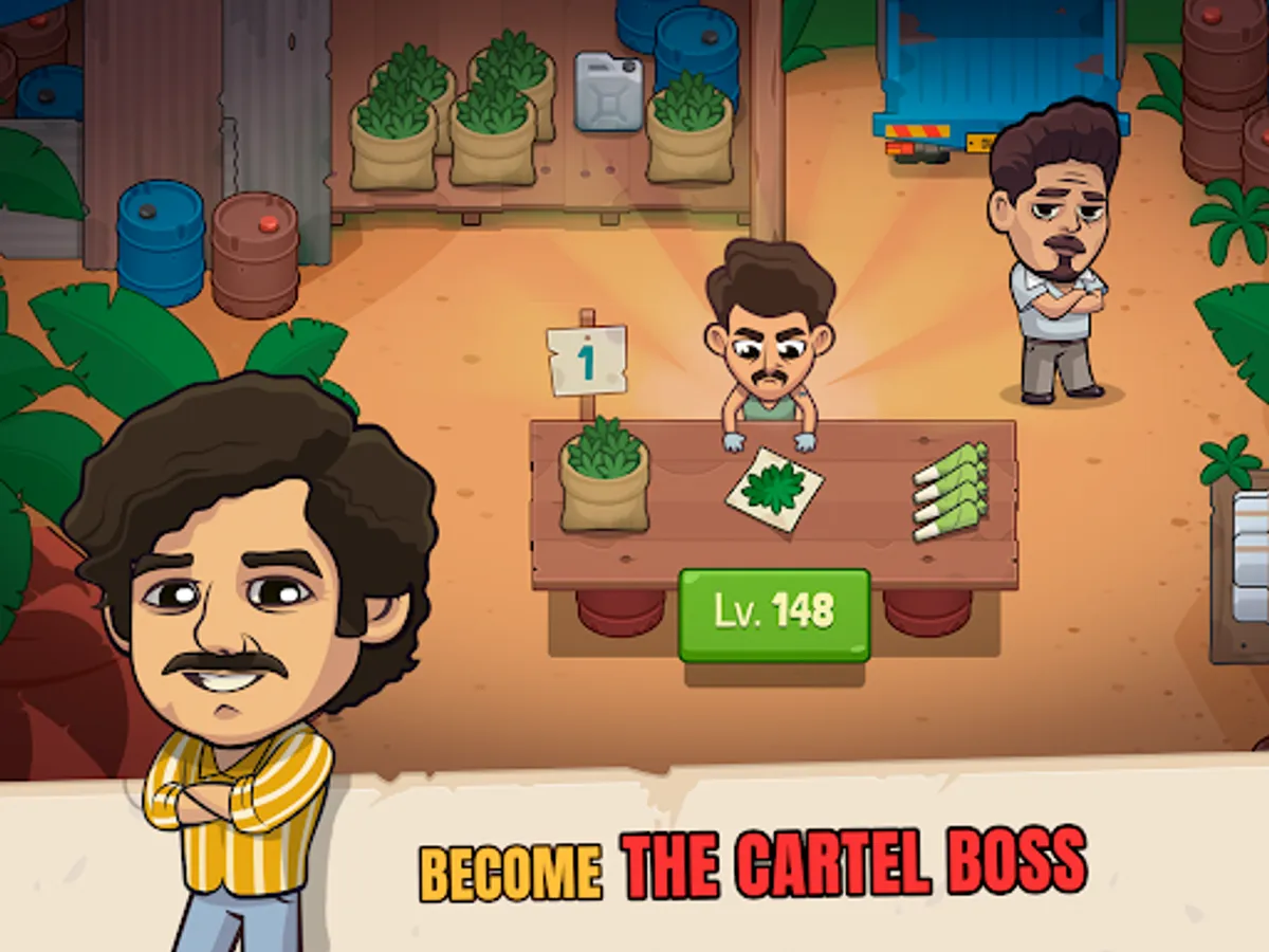 Collect and upgrade a roster of special characters and earn higher profits and permanent upgrades to your production pipeline. Unlock legendary characters from the series including El Patrón, Colonel Carillo, Don Neto, El Mexicano and many more. Manage and upgrade your gang of criminals to improve your idle progress.