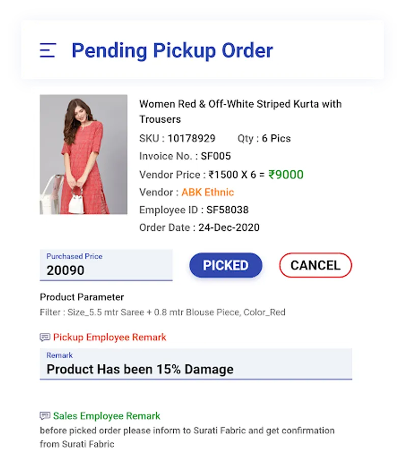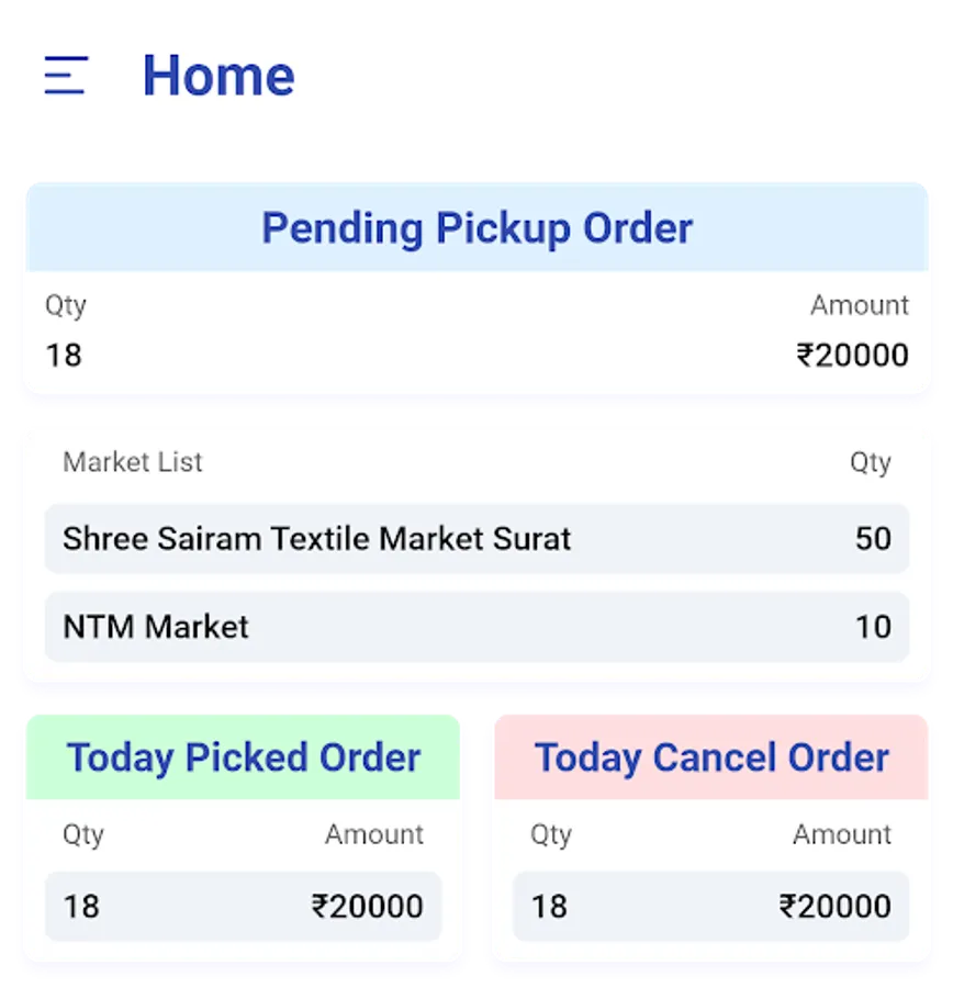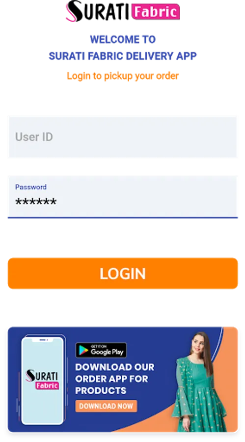 Surati fabric Delivery app is use for Surati fabric staff and sales person for Dispatch of ecommerce products and pick up multiple orders online. This app is design for Surati fabric order pickup persons and they can login using their details. After login they will receive daily order pickup details with products and seller information.