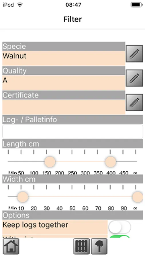 A Veneer warehouse Management information App. The inventory can be synchronised with the images attached to the veneer. Filter functions are available to search for specific data with the ability to filter for species, length, width, with/without pictures and multiple qualities. With an integrated share feature for tallies and pictures.