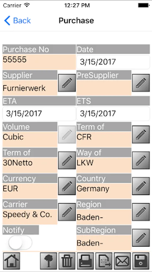 This app serves the purpose of offline timber purchases. Synchronize master data of main system to your device. Create a purchase and add all purchase information’s and logs. Send timber purchase to main system by upload and/or email. In addition print purchase confirmation on mobile printer.
