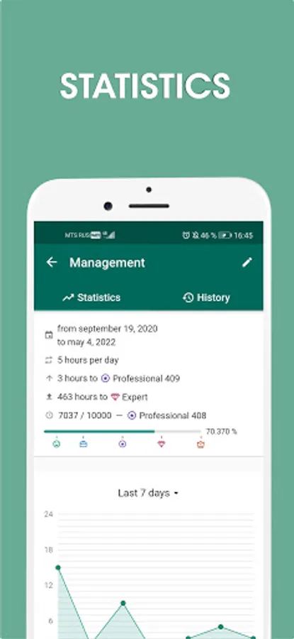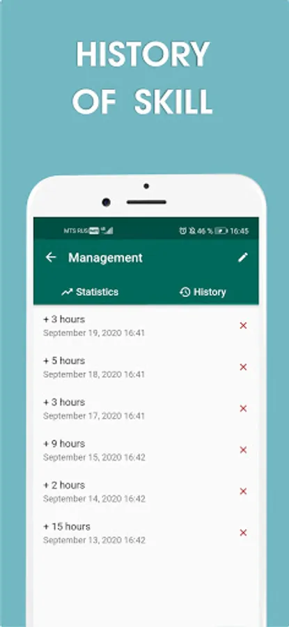 In the "10,000 hours - skill tracker" application you can view skill statistics. You can also view the skill history.