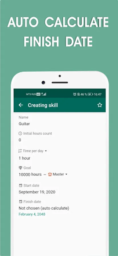 When creating a skill, you can specify how long you want to practice per day or week or month and in the "10,000 hours - skill tracker" application will automatically calculate the end date for the selected goal. Let's go self-improvement.
