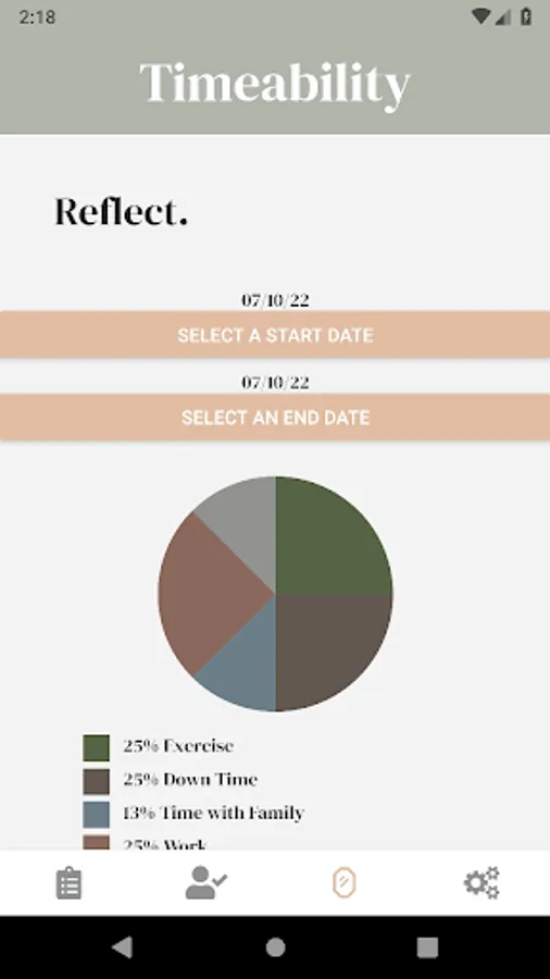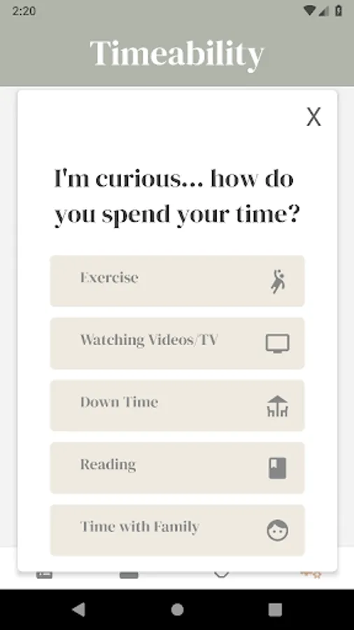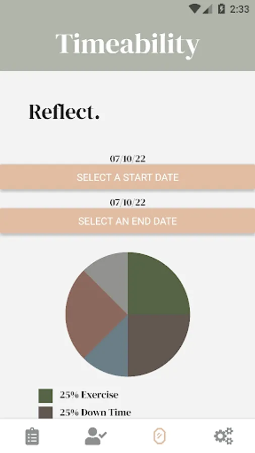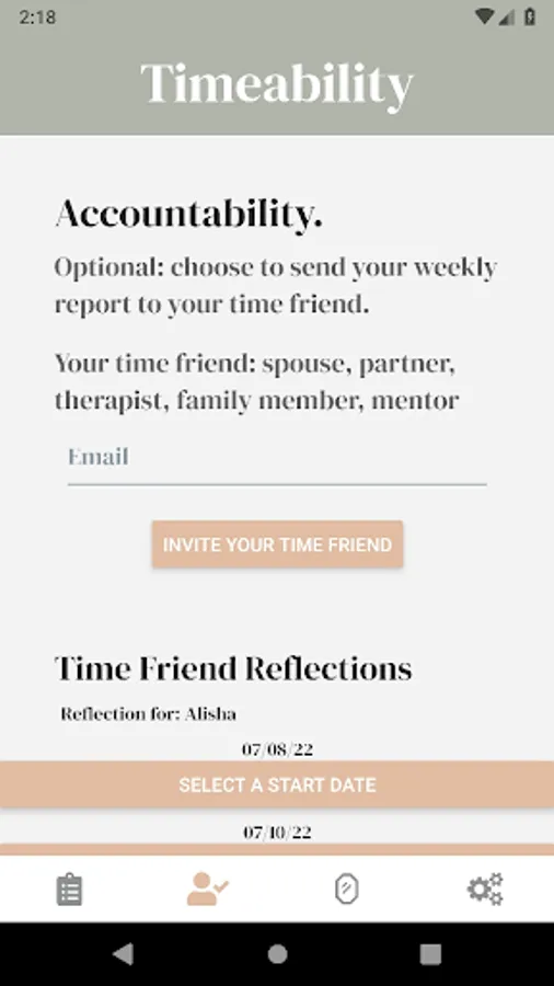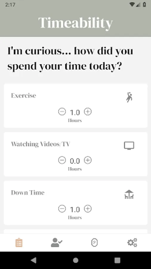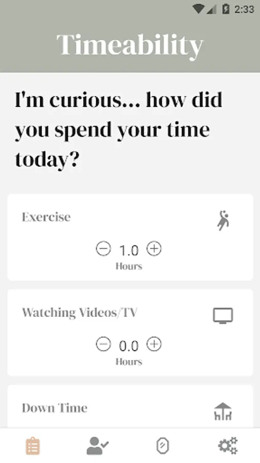 Welcome to Timeability… here to help you see how your time is spent. You’ll check-in daily, input how you spent your time, and receive a report weekly.
