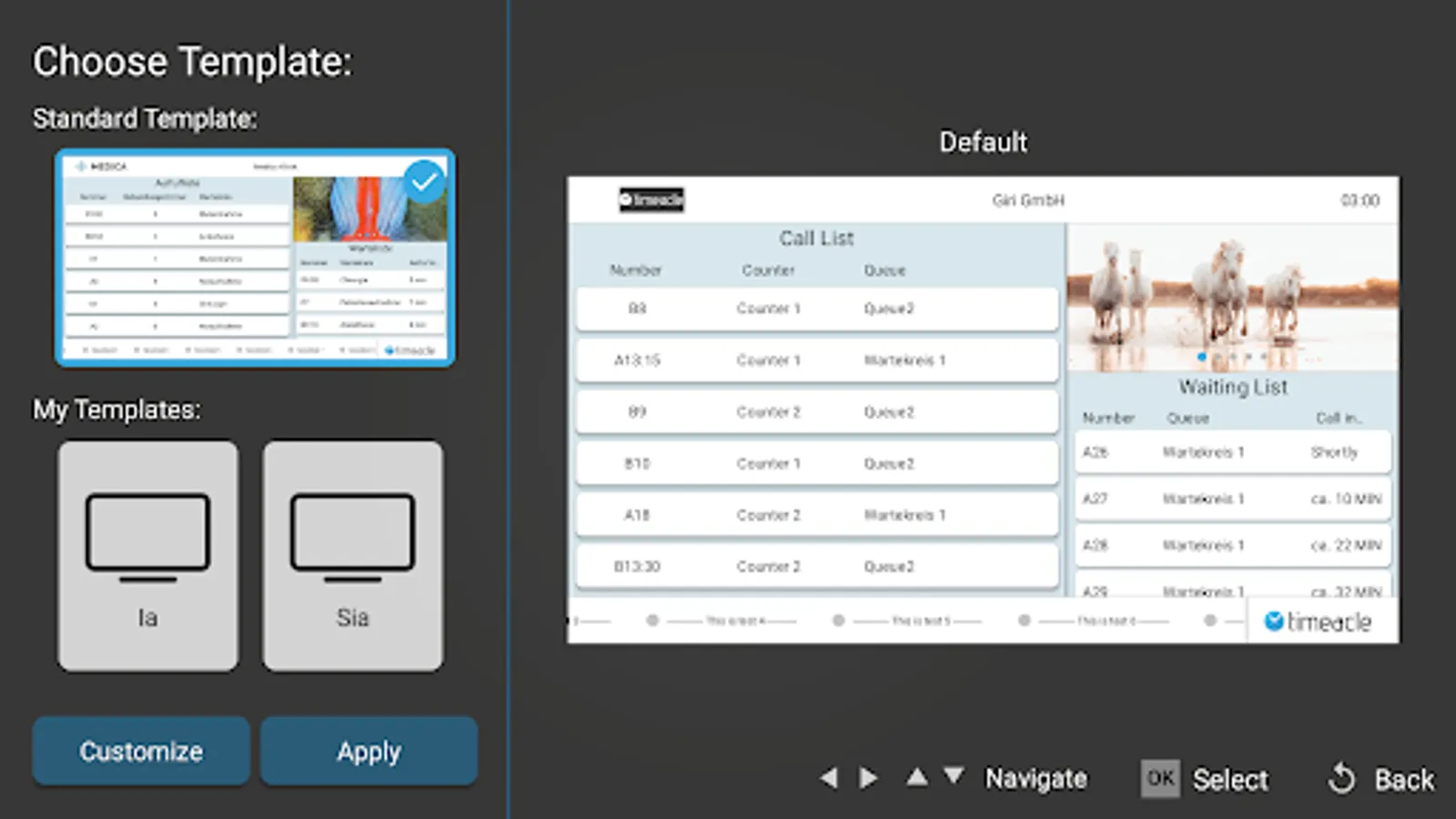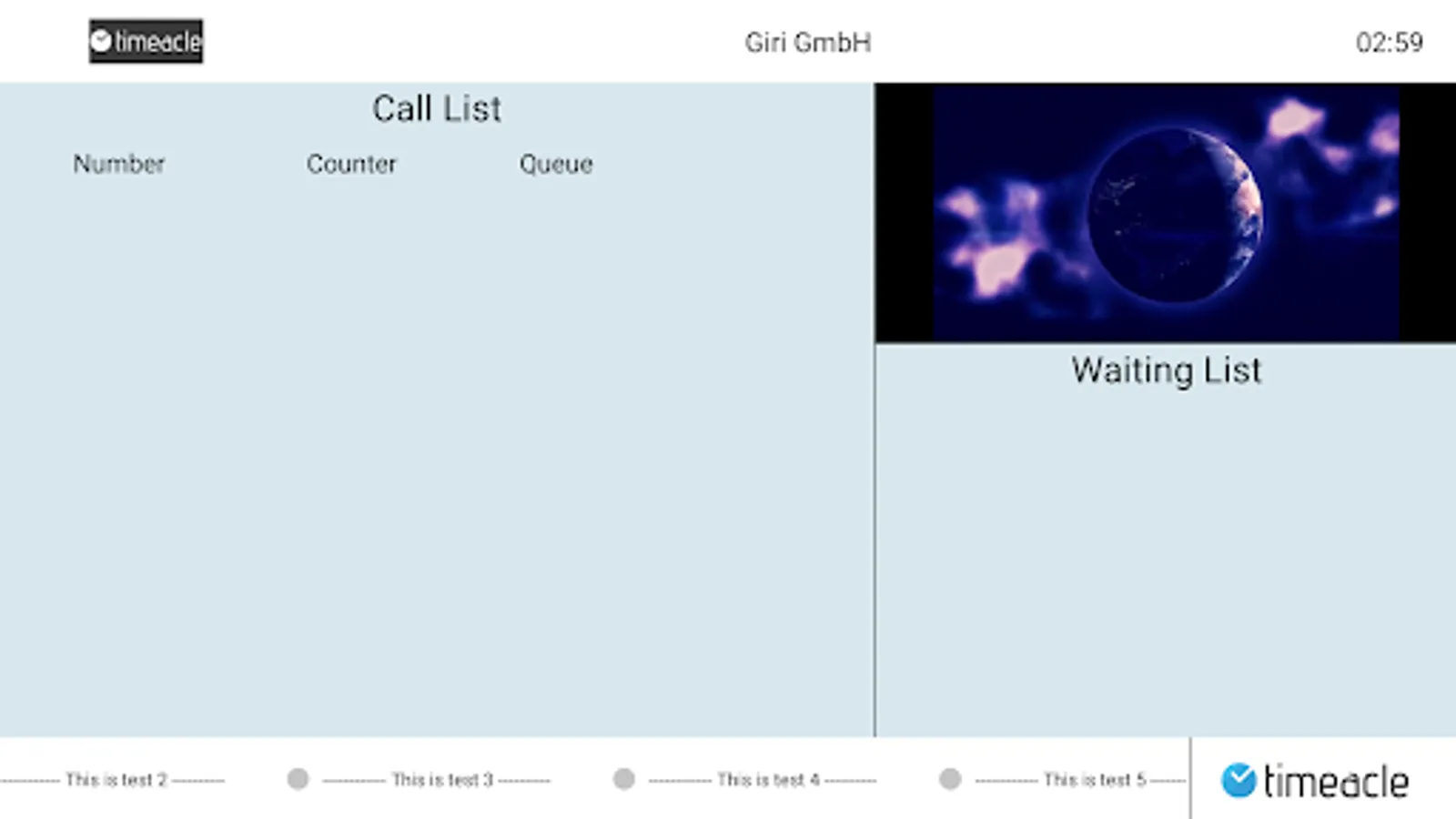 The new timeacle Display displays the current waiting and call-up situation of your waiting area. You can see the called and waiting list. The called list clarifies which tickets are already served where as the waiting list shows which tickets are waiting to serve. You can also see in which counter to go. It has also media footer and header section. You can create your own template and adjust the app according to your waiting area requirements.