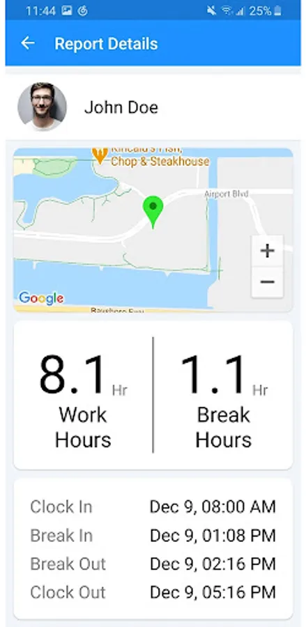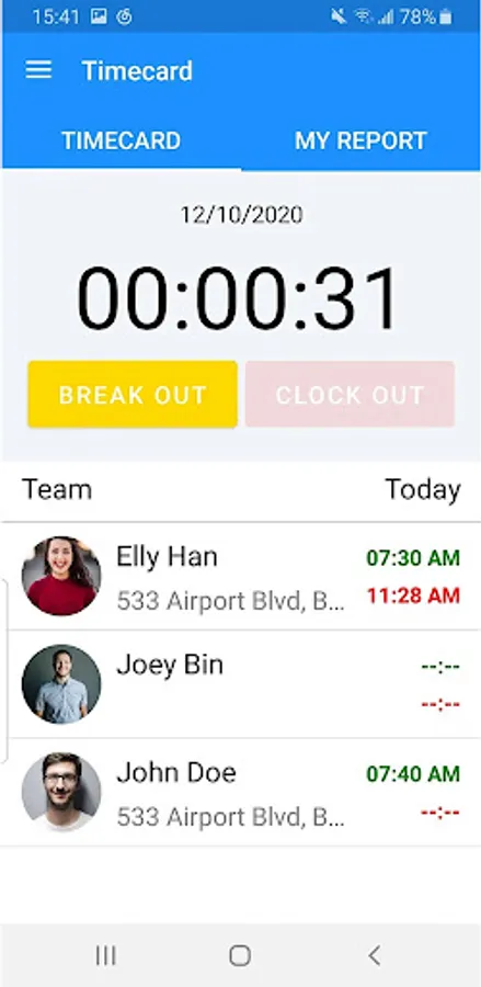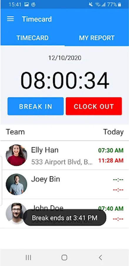 • Time-clocking features to track working hours, and breaks ― a simple design allows workers to clock-in-and-out of work, and take breaks with the click of a button