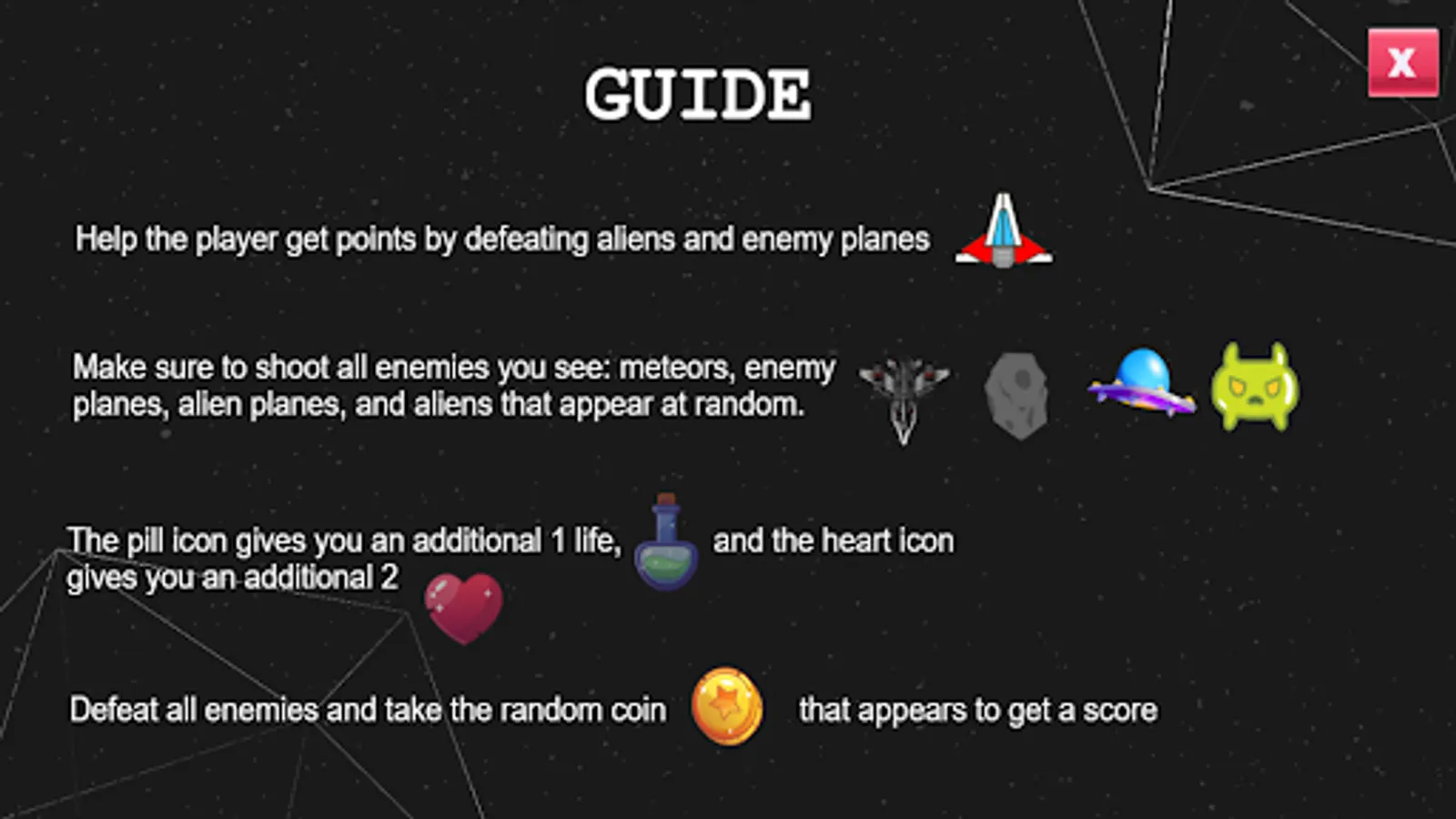 - Make sure to shoot all enemies you see: meteors, enemy planes, alien planes, and aliens that appear at random.
