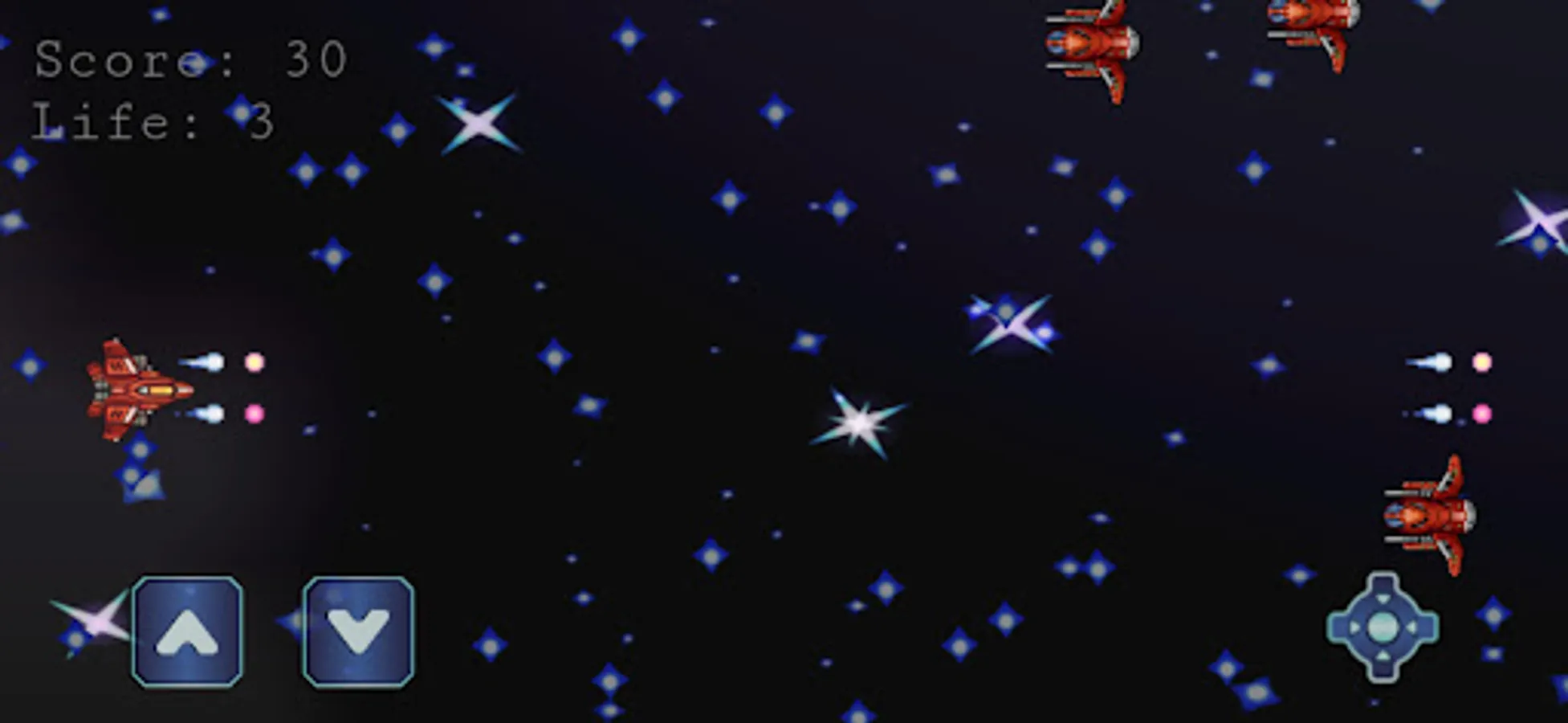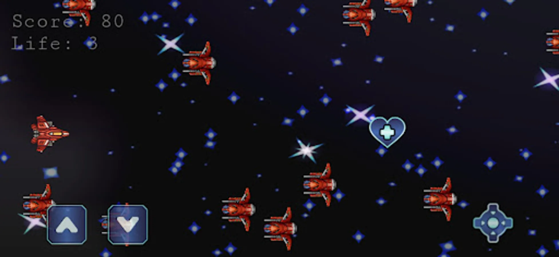 Space Ship is a shooter game whose objective is to kill enemy ships. The Player's ship must be moved up or down to avoid enemy ships coming to kill the player's ship. Ship players can also take hearts that can add lives. Let's help Player Ships to kill enemy ships.