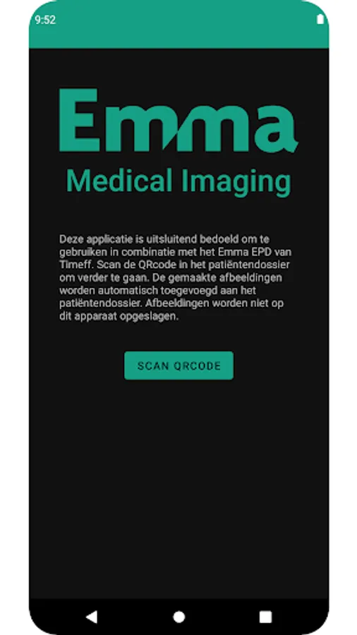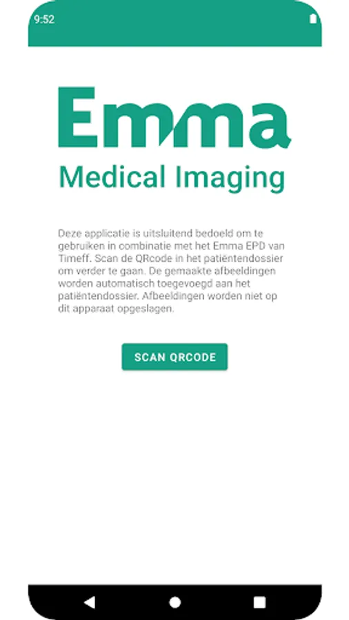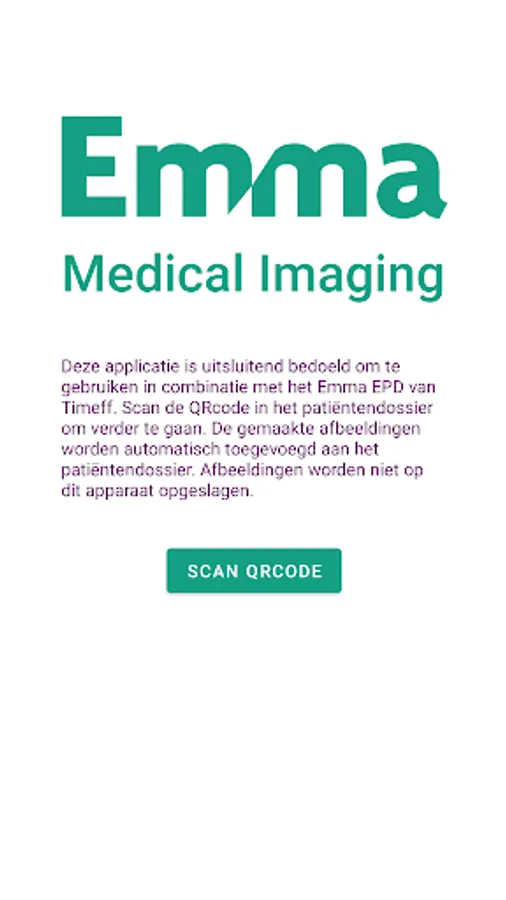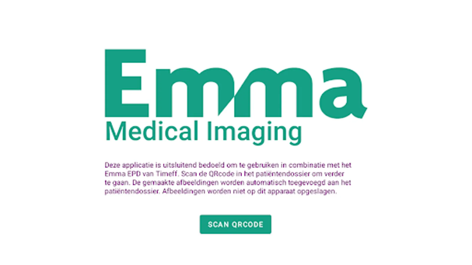 This application is only intended to be used in conjunction with Timeff's Emma EPD. Scan the QR code in the patient file, the images created are automatically added to the patient file. Images are not saved to the device.