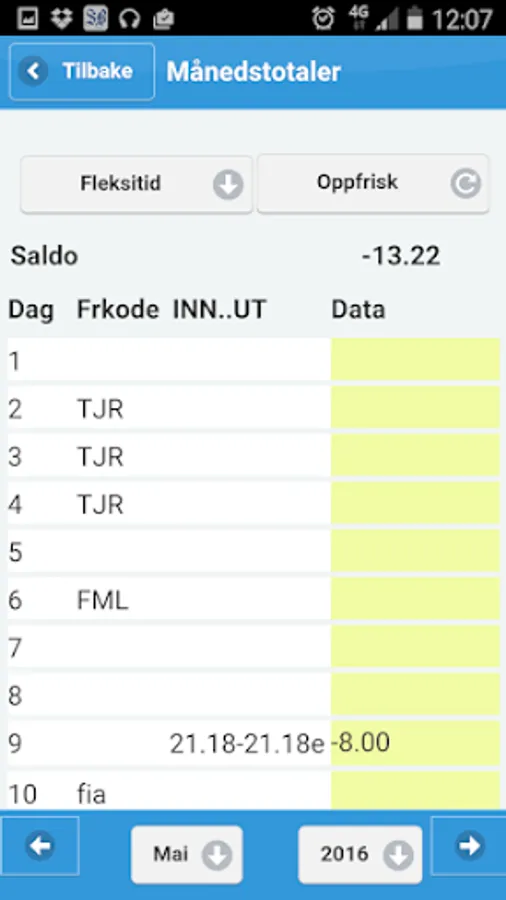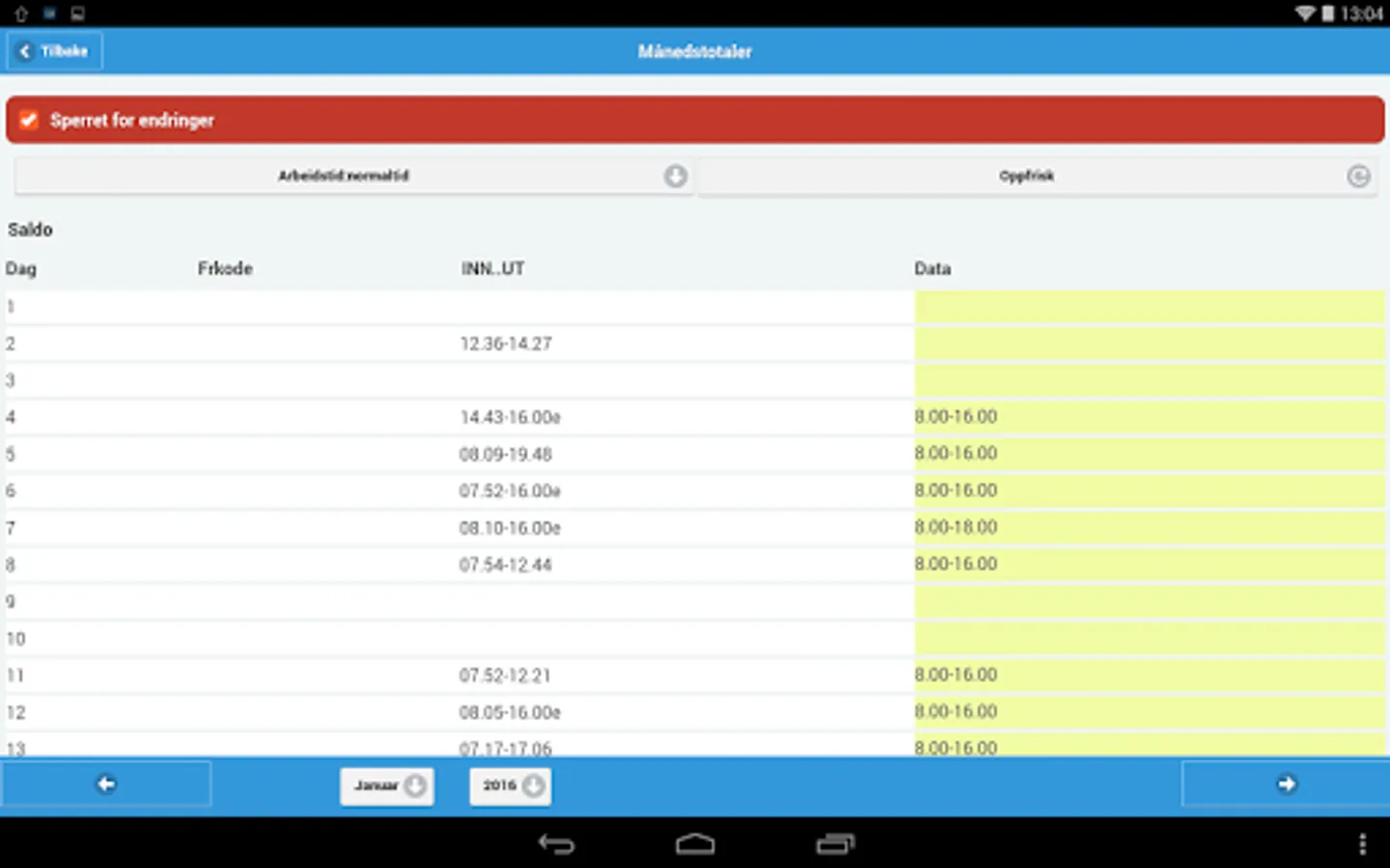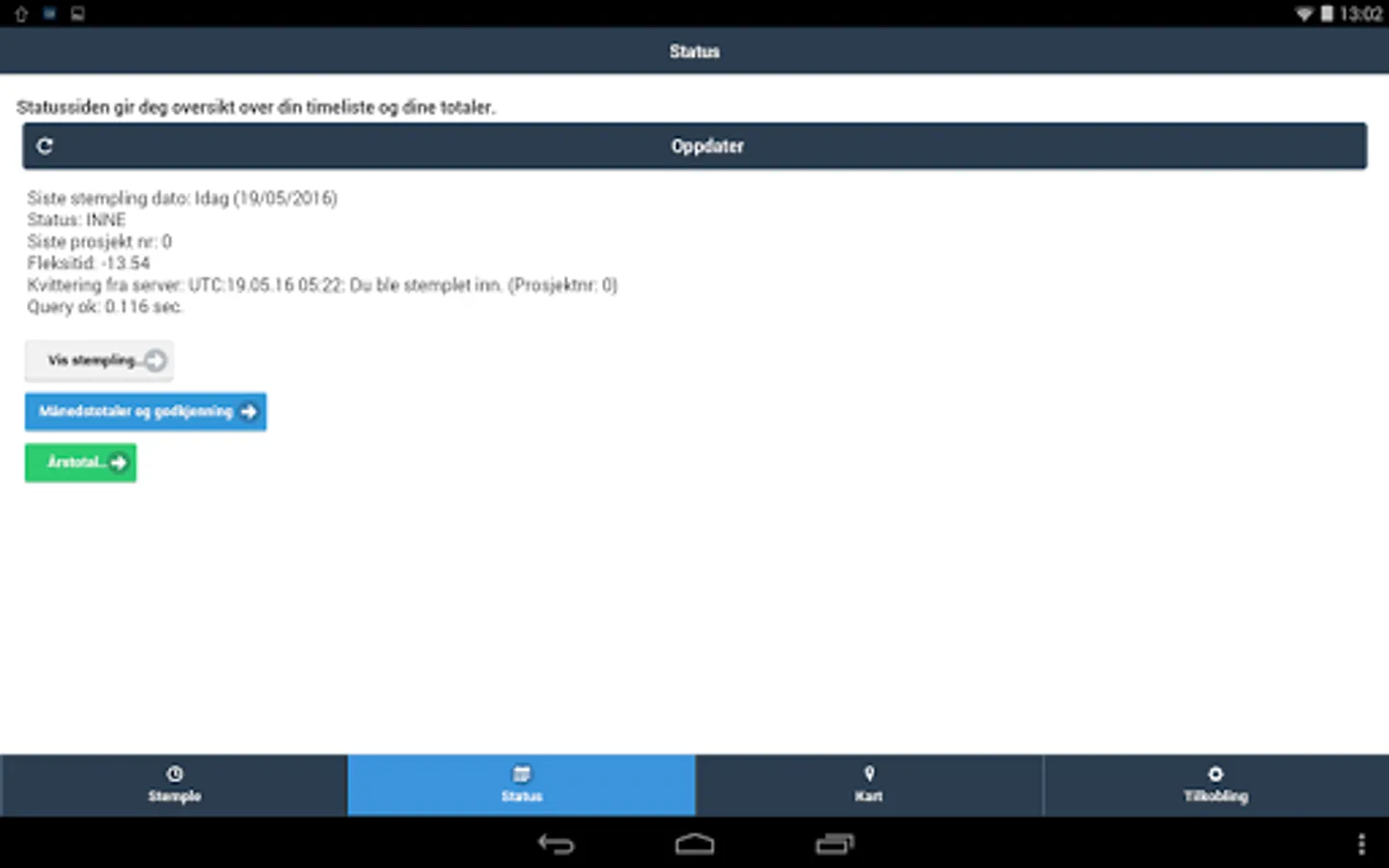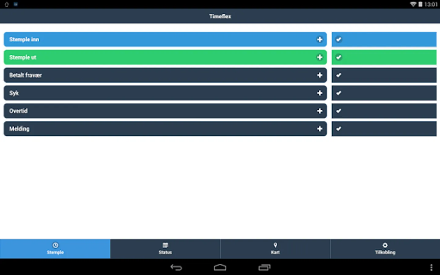 Use Timeflex time recording against Timeflex R.E.S.T. server on the cloud. Simple and functional. Contact support@timeflex.no to get started. The application also supports time registration against projects. Keep track of flexible time, overtime, absences and holidays. Employees can also apply for holiday and leave directly in the app. Managers can easily approve/reject holiday applications and get an overview of a number of other parameters such as remaining holiday, holiday balance, sick leave, sick self-reports in the last 12 months and sick child absence.