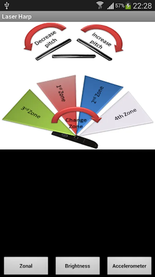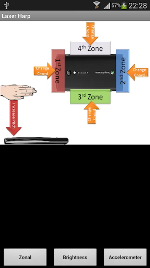 This is a 'Laser Harp' and it turns your phone into a musical instrument that you play by moving your hands in the area above the phone. There are 2 different types of hand control and an accelerometer mode where you simply move the device to change the sound.