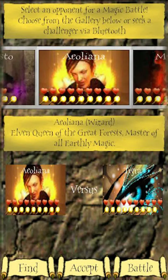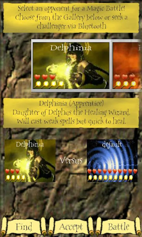 Welcome to Magic Battle! This application lets you wield your phone just like a real magic wand and have real wizard battles with other people just like your favourite screen wizards! To cast spells you wave the phone in a particular pattern, for example, an anticlockwise circle would cast a 'Heal' spell. You will start off as an Apprentice and will learn new spells as you get more practice and gain experience in combat.